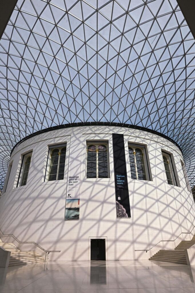 The museum’s architecture also contributes to its distinctive atmosphere. At its center lies the Queen Elizabeth II Great Court, a vast glass-roofed atrium designed by architect Norman Foster. The luminous space brings natural light into the historic complex and has become one of London’s most striking public interiors.