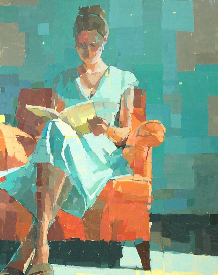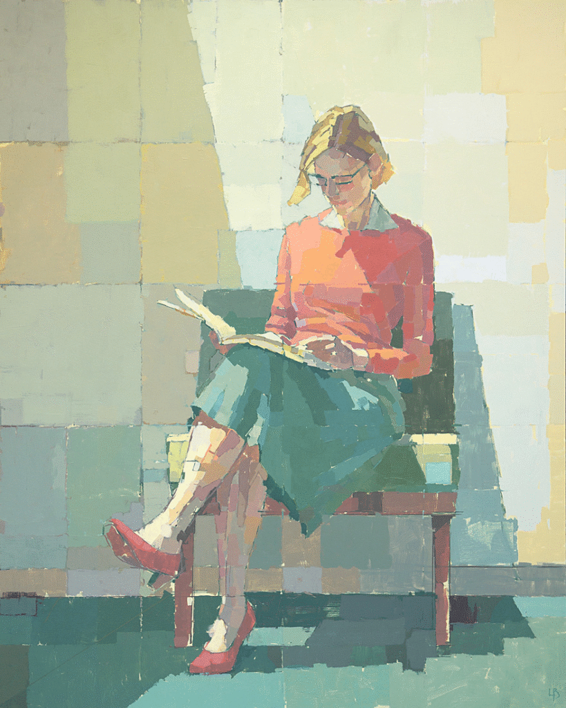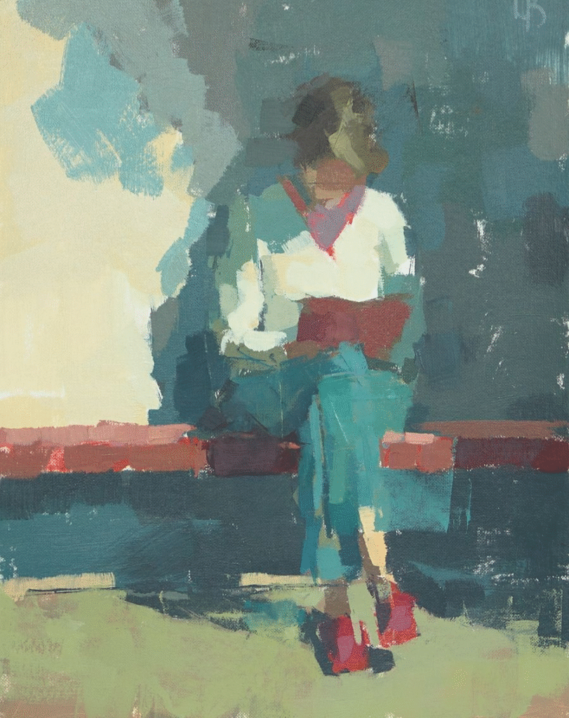 There is restraint in his palette and clarity in his shapes, but also a subtle playfulness that makes each canvas feel alive. Ollie’s work balances precision with spontaneity. Flat planes of color meet unexpected textures; controlled forms are interrupted by a flicker of looseness. His paintings invite viewers to notice how much meaning can exist in the simplest arrangements. Recent works such as Reader and Reaching Out reflect this quiet power: pared-down yet resonant, structured yet full of breath. Through his practice, Ollie shows us that acrylic painting does not need to be loud to be impactful. In his hands, minimal forms and gentle tones become invitations to pause, reflect, and discover stories hidden in the spaces between.