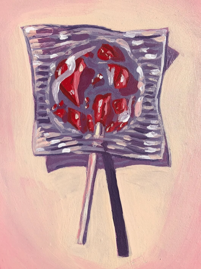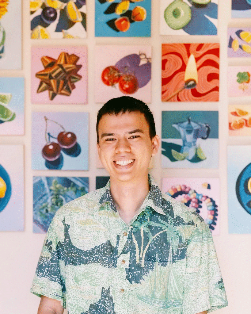 For James Mertke, acrylic is both play and devotion. A self-taught acrylic painter from San Jose, California, he infuses everyday objects with color, charm, and character turning the ordinary into something you can’t stop staring at. James is known for his vibrant still lifes: fruits, candies, snacks, and items of nostalgia all appear in his work, painted on small panels that demand both intimacy and presence. His pieces don’t overwhelm: each one reads like a quiet celebration of shape, hue, and detail. His style balances precision and spontaneity. The edges are clean, the color bold, but there is always a sense of delight in his choices: a tilt of light, a shadow, a saturated tone.