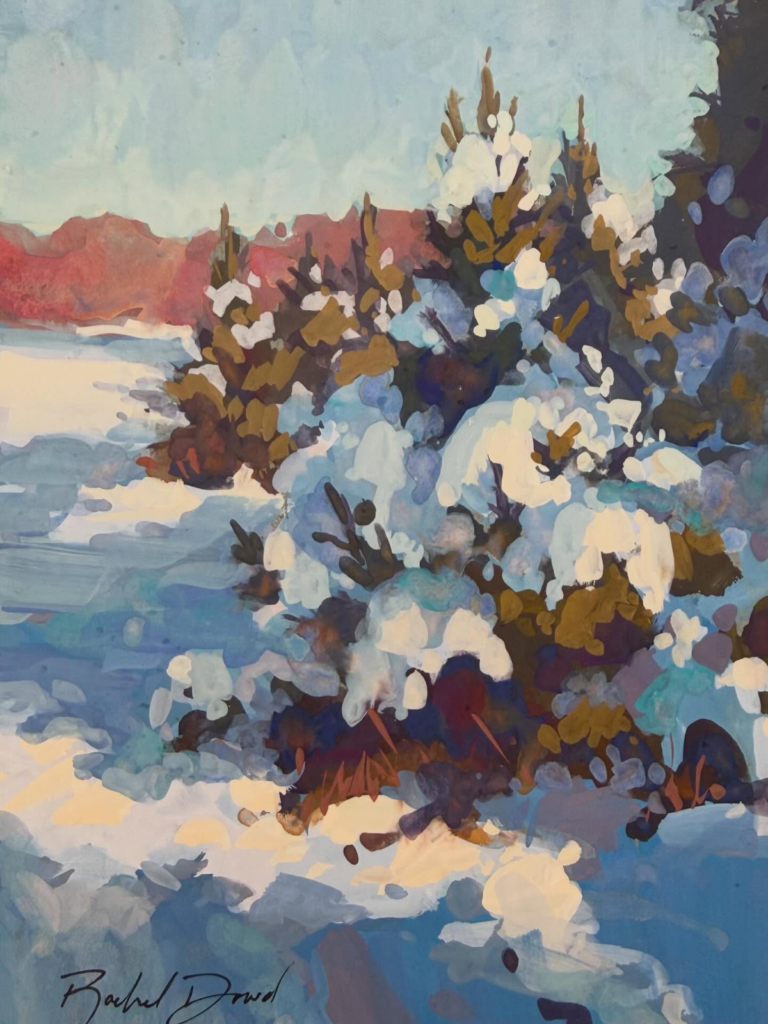 What makes Rachel’s work resonate is the emotional honesty beneath the brushstrokes. There’s no longing to dramatize; instead there’s acceptance, humility, presence. Her paintings aren’t about perfection they’re about reality, as felt. A simple barn in a snow-dusted field becomes more than landscape; it becomes memory, atmosphere, a space to rest. A rolling meadow under soft sunlight becomes a breath, a quiet solace. Through her art, Rachel shows us that even the most familiar places hold subtle poetry, waiting to be seen. Her process also feels generous. She shares glimpses of her journey: the light that drew her outside, the small panel she chose, the brush she loaded with pigment. She reminds us that painting is not always grand or polished: sometimes it’s humble, immediate, responsive. In doing so, she invites us into the act of creation, to witness and maybe even feel the world as she does. Rachel’s evolving practice is a testament to the power of staying open to nature, to light, to change, to patience. Her gouache and oil works remind us that art doesn’t always need to shout; sometimes it just needs to listen. To the wind, the leaves, the earth, the quiet spaces between moments. And if we lean in close, we might hear it too.