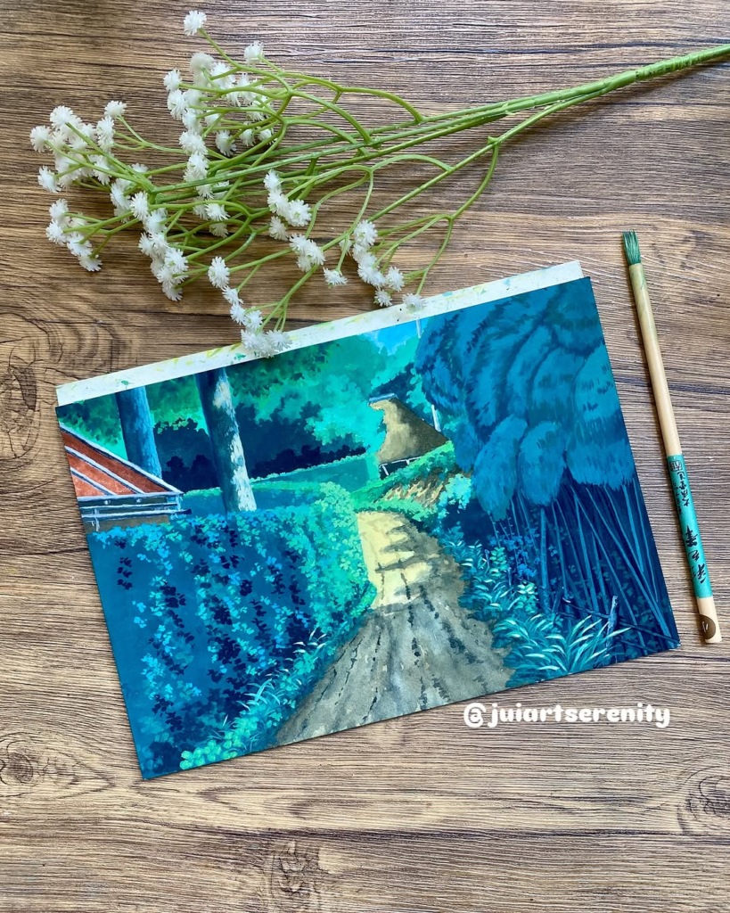She leans into the medium’s quick-drying rhythm, staying close to instinct and allowing each stroke to land where it feels most true. Colours bloom gently, forms stay poised yet delicate, and shadows hold a lived-in warmth. Nothing feels forced; everything arrives with the ease of a memory unfolding. Her compositions often feel like intimate sanctuary scenes built with quiet care, rooted in stillness. There’s a soothing balance in her lines, a subtle dialogue between muted tones and soft highlights. Even in the simplest subjects, she evokes comfort, gratitude, and pause. It’s as if her paintings whisper that peace is rarely loud; it lives in the moments we choose to notice. Jui’s work is anchored in presence. It doesn’t seek spectacle, it offers sincerity. She reveals how gouache can carry emotion through gentle gradients, thoughtful colour pairings, and the closeness of small-scale compositions. Each piece becomes a soft invitation to slow down, breathe, and reconnect with yourself. Through her evolving practice, Jui reminds us that serenity is not an escape but a way of seeing. Her paintings offer refuge a quiet place for the heart to rest. In her hands, gouache becomes a vessel for tender wonder, capturing the beauty of stillness one thoughtful stroke at a time.