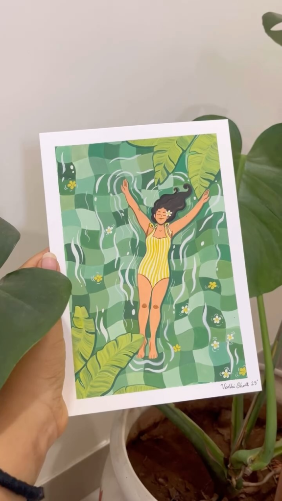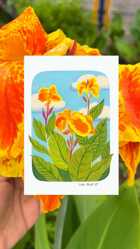 She observes before she paints. She listens before she chooses a color. She lets her subjects often the simplest flowers and leaves guide the mood of a piece rather than forcing them into structure. In her studio or by a window, she studies how morning light skims across petals, how shadows shift with passing clouds, how a bloom begins to open or close depending on the hour. These observations seep into her work, giving it a living, breathing quality. If you look closely at her gallery at the soft washes of color, the gentle outlines, the floral forms you may find yourself slowing down too. Maybe you’ll notice a petal you hadn’t seen before, or the curve of a leaf you’d never paused to observe. Maybe her sketchbook studies nudge you toward moments of your own life that deserve a second glance. That’s Vidhi’s gift: her art doesn’t just depict it teaches us to look again. Her evolving body of work is a reminder that beauty isn’t something we have to chase. It’s already here, tucked into the folds of everyday life in a handful of flowers, in the soft fade of watercolor, in the quiet attention of an artist who truly sees.