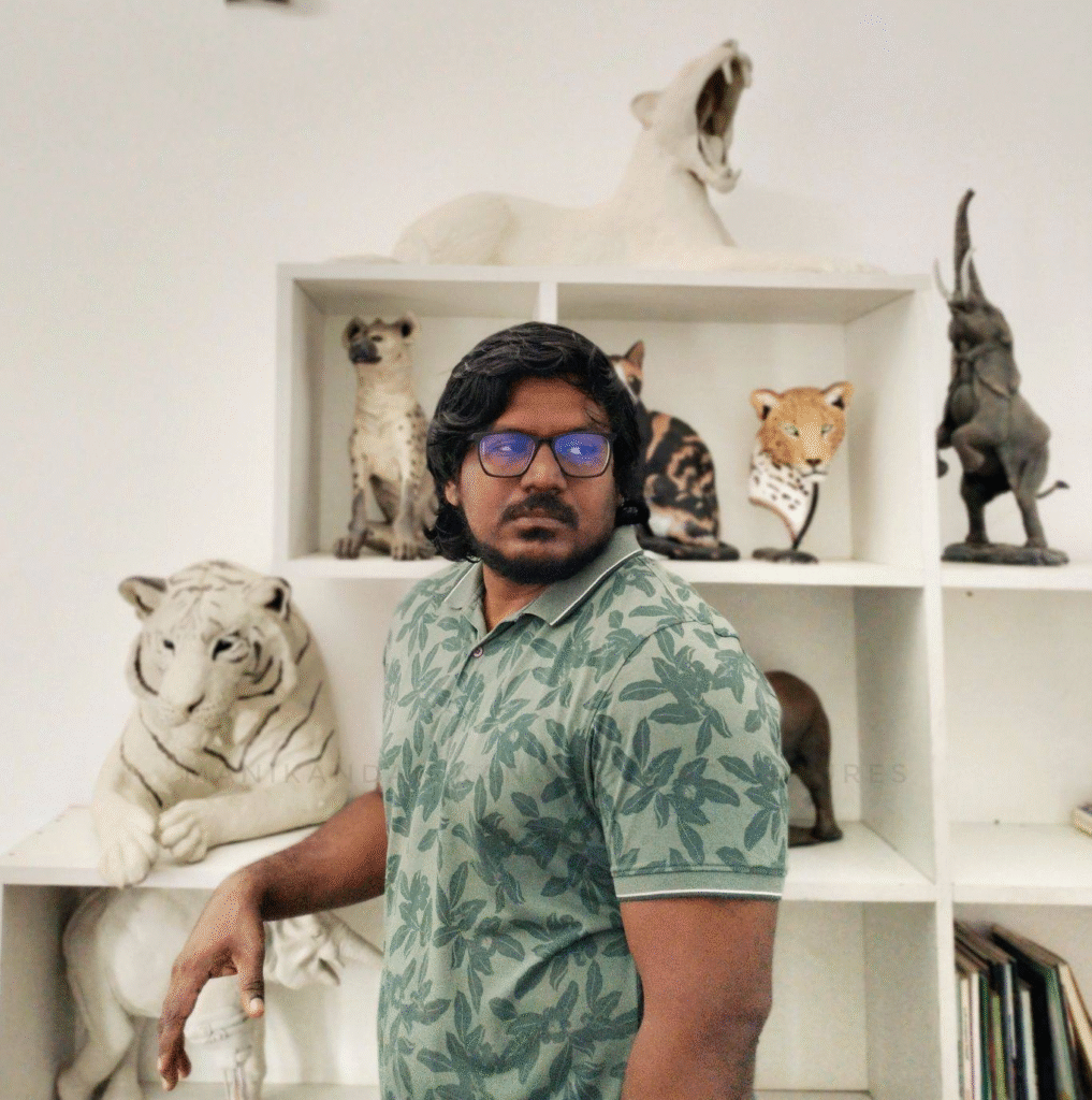 His process feels meditative, rooted in deep observation and respect. What makes his art especially moving is how he bridges the wild and the intimate. Wildlife is often depicted as distant, untouchable, larger-than-life. In Manikandan’s hands, it becomes close, familiar, and emotionally real. His sculptures remind us of our connection to the animals we share the world with their gentleness, their resilience, their quiet wisdom. Each piece feels like a moment of encounter, the kind that lingers long after you’ve walked away. Manikandan’s sculptures are not loud expressions; they are serene, grounded, and full of heart. His studio is a working space in the truest sense, tools scattered, works in progress resting beside finished pieces, light falling across textured surfaces. It’s a place where time moves differently, where repetition and patience guide the work. Even without a long-written biography, his art tells the story clearly: he is someone who builds connection through form, someone who listens to the material and the subject until both find their way into sculpture. Manikandan’s pieces don’t try to impress; they invite a quiet moment of looking. They feel steady, grounded, and made with genuine care the kind of work that stays with you long after you’ve stepped away from it.