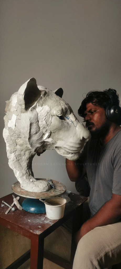 Manikandan Kanchana’s sculptural world feels like standing in the quiet presence of a creature who has paused just long enough for you to meet its gaze. Based in Chennai, he brings animals to life with a tenderness that goes beyond technique; there is reverence in his hands, patience in his process, and a deep love for the natural world in every curve of clay. His work often centres around wildlife, especially elephants, whose majesty and gentleness seem to echo through many of his pieces. But these sculptures are not just anatomical studies; they are emotional portraits. A tilt of the head, the weight of a step, the softness around the eyes, Manikandan gives each creature a soulfulness that invites connection. You don’t just see the animal; you feel it’s quiet strength, its calm, its story. In videos and process clips he shares, you witness clay slowly gathering form under his touch. What begins as raw material becomes something almost alive. You can sense the rhythm of sculpting as he adds and removes, refines and listens not just to the sculpture, but to the essence of the being he is creating.