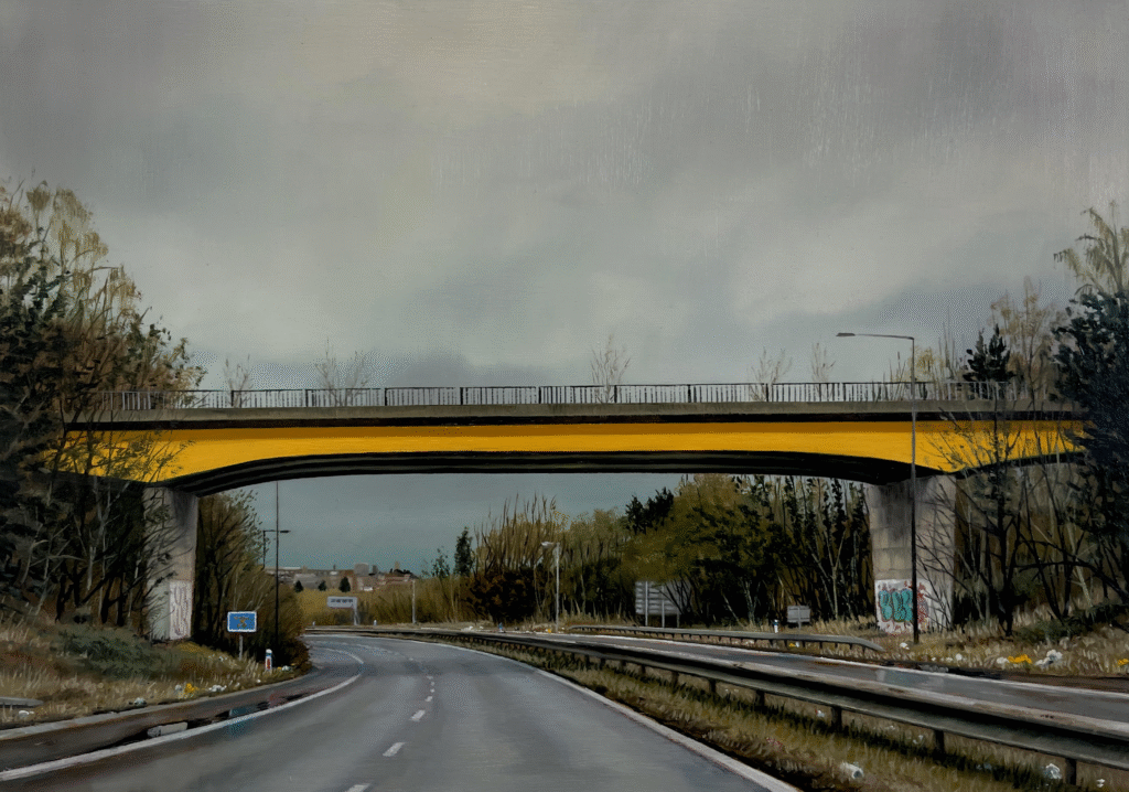 Jen Orpin is a Manchester-based oil painter whose work turns the stark presence of motorway bridges into powerful reflections on memory, connection, and belonging. Working primarily in oils, she captures these brutalist structures with a painter’s sensitivity to light, surface, and atmosphere, transforming concrete and steel into landscapes charged with emotion. A graduate of Manchester Metropolitan University in Fine Art (1996) and a long-standing member of Rogue Artists’ Studios, Orpin has developed a practice that pushes the boundaries of what figurative oil painting can hold—elevating the ordinary into something monumental. Her motorway bridge series grew out of personal grief, when long drives to visit her father in hospital made these bridges markers of both progress and pause.
