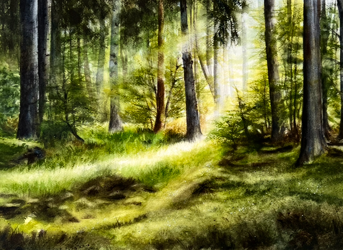 Annett Coumont is a German watercolour artist based in Bergisch Gladbach, whose work grows from a quiet devotion to nature and to the fleeting moments that might otherwise pass unnoticed. Her art doesn’t rush to impress; it observes, listens, and lets the moment reveal itself. For Annett, watercolour is not just a material it’s a companion in discovery, one that mirrors the rhythm of nature itself. It allows her to work in that delicate space where planning meets coincidence, where the artist guides the flow but never entirely controls it. “Only in harmony,” she writes, “on that narrow edge between intention and chance, can true artistic results be achieved.” This belief runs through everything she creates. Much of Annett’s inspiration comes from time spent outdoors walking through forests, watching the light change over open fields, or standing quietly by water. The sky, trees, reflections, even the stillness of moorlands all find a place in her work.
