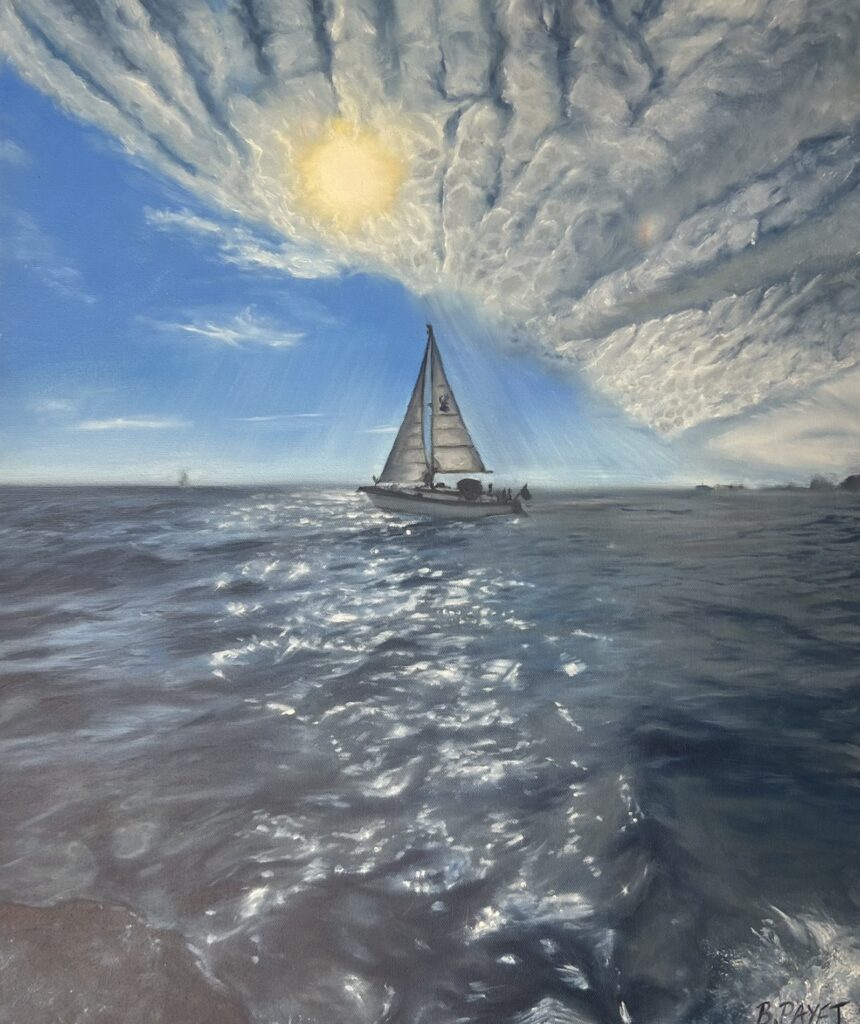 Her practice is anchored in photorealism waves, ripples, boats, and reflections rendered with near-tactile precision yet her work transcends mere depiction. Each painting invites the viewer not only to see the sea, but to feel it: to sense the cool hush beneath the surface, to follow the rhythm of light and shadow, to hear the pause between one swell and the next. In her words, she paints not just what the sea looks like, but what it is: a meeting of motion and stillness, of energy and calm. Every wave she paints holds a moment of transition: a crest about to fall, a reflection about to shift, a colour about to fade. Through her work, Debbie Daniels transforms the ocean into a meditation on time and transformation reminding us that even the smallest ripple carries the vast, unending story of the sea. What defines Debbie’s art is her balance of precision and mood. The sharply rendered texture of sea foam meets the calm suggestion of a horizon at dusk; the flicker of light on water meets the stillness that follows motion. Her large-scale oils pull the viewer in look long enough, and you’ll feel the swell, the salt, the hush after the crash.