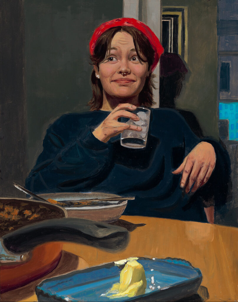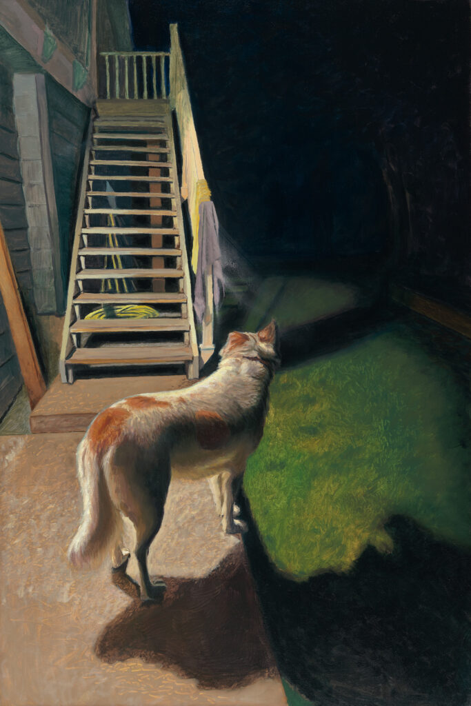 Usually, I like to have complete control over my painting process, but there are times when things happen and you don’t expect it, and you get lucky. It doesn’t happen often but when it does, it has the potential to add an entirely new level to the painting. I painted a figurative painting of my dog in my backyard, and there were towels hanging on the railing, and when I went to varnish the painting, some of the paint pulled off of the towels and made this sort of ghostly mark that trails into the darkness. Though this was a mistake, it totally added a kind of spiritual component that I wasn’t expecting in the painting, unintentionally it added to the uncanny feel of the painting.