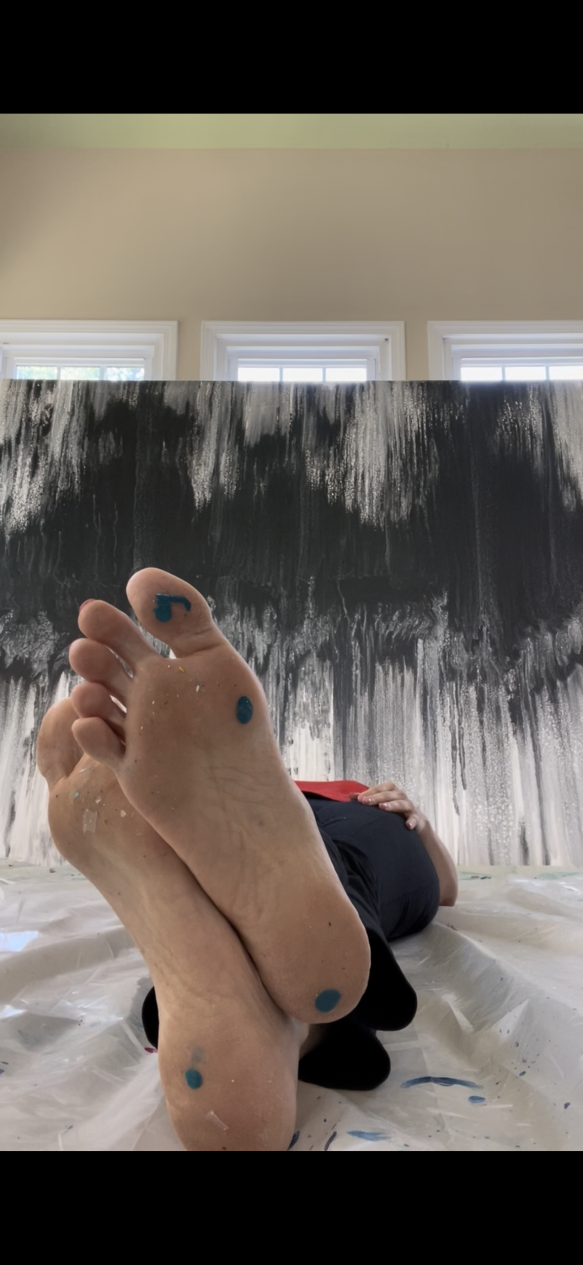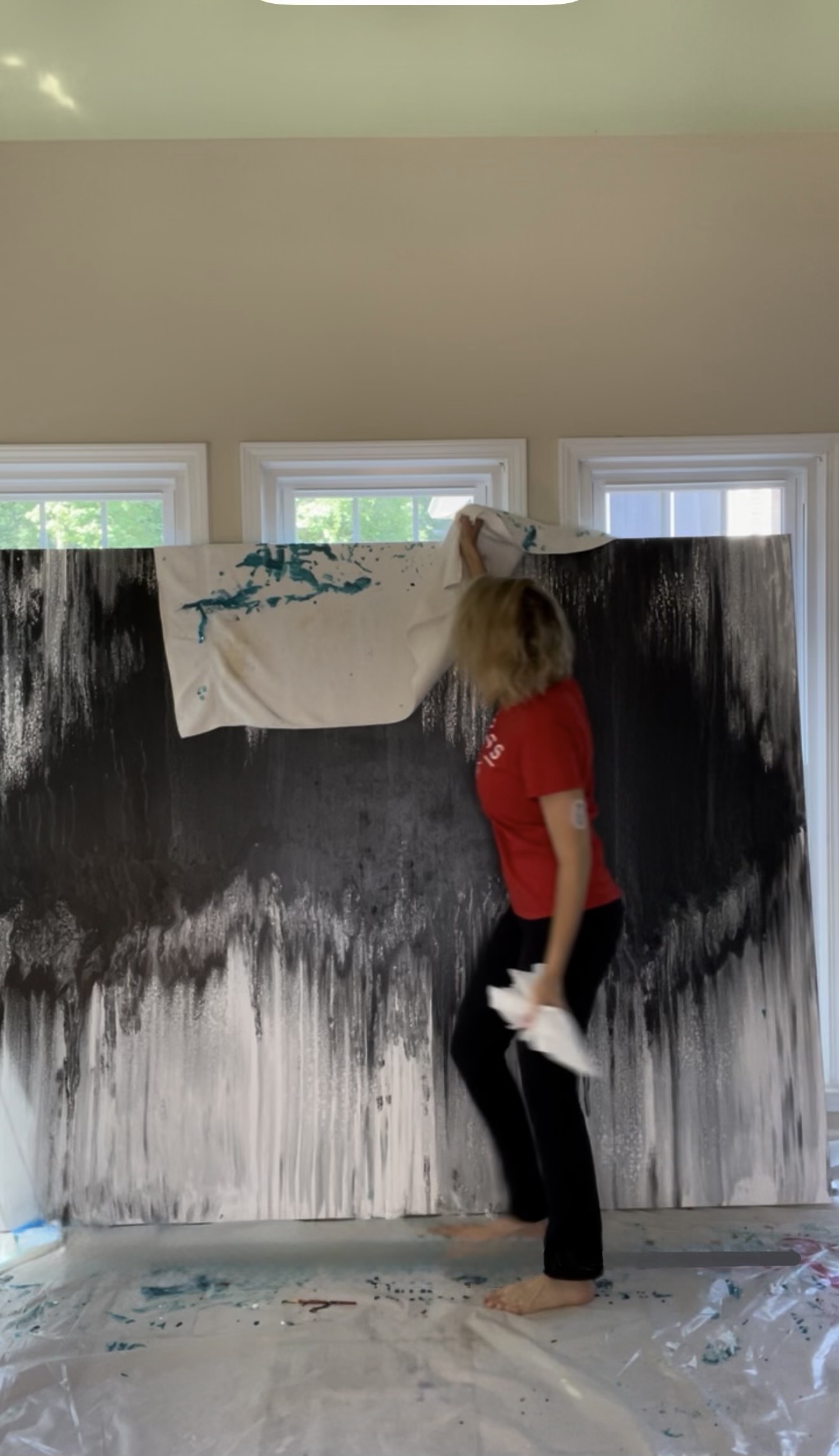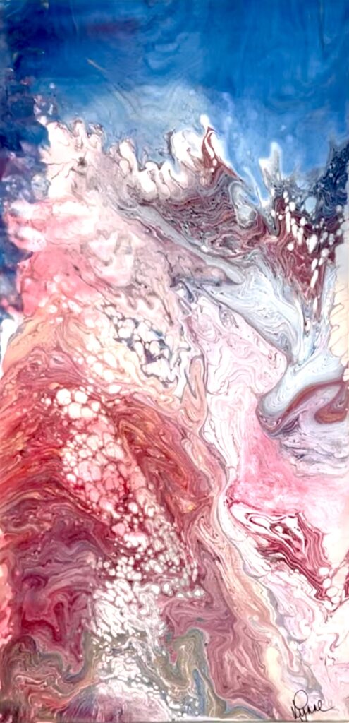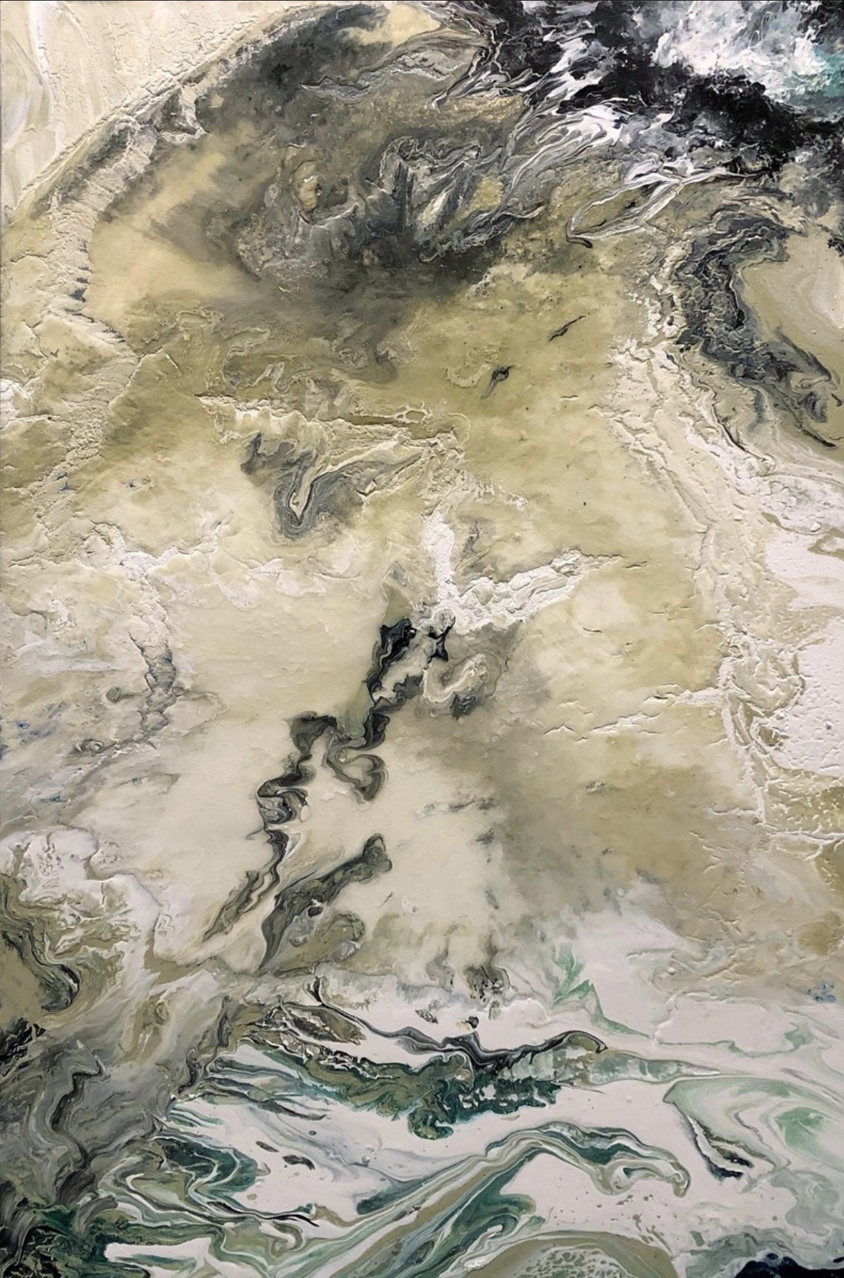 I was told by a mentor and teacher that there are two types of artists: those who are natural and those who are learned. It has taken me a lifetime to know that I am a natural artist. The kind that picks up things and thinks, “I wonder what this will do.” I mix my own paints and add various additives or mediums to achieve different viscosities, then pour them onto the canvas. I use a blowtorch, forks, straws, paintbrushes, and fingers… whatever is handy. I’m intrigued by what materials do when they organically repel instead of blend. I’m fascinated by the organic beauty in nature. Most often, my inspiration comes from water.
