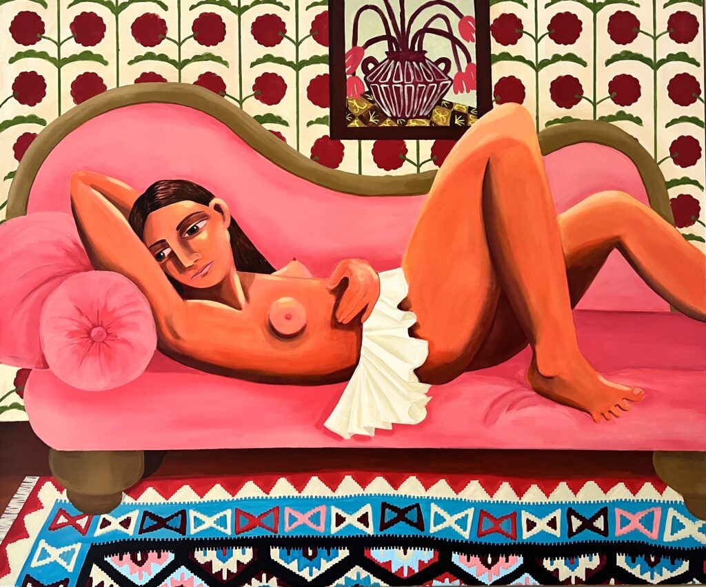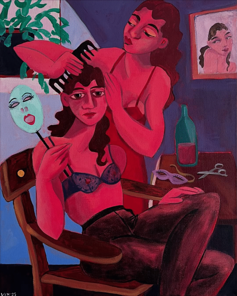 The patterns and settings come from a long-standing love of textiles, something I carried with me from my years in fashion. I like the feel of fabric, the structure it can give, and how a pattern can set a mood. In my paintings, it’s more than decoration—it connects to my background, but it also builds atmosphere, adds rhythm, and sometimes hints at the story behind the figure. They’re part of how I shape the scene, not just fill it.