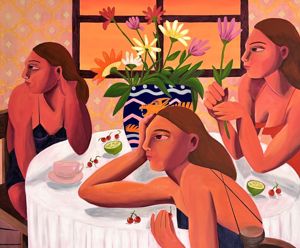 I like my work to be layered. At first glance you might see a colourful, cheerful scene, but if you stay with it a little longer, small frictions or things that don’t quite fit start to appear. I enjoy that mix—it’s never only lightness, and it’s never only serious. There’s usually some humour or a wink in there too. I don’t expect one fixed reaction; some people are drawn to the colour and patterns, others pick up on the tension. I like it when people recognise something of themselves in the scene—that moment of ‘oh yes, I know this’. And it’s always interesting to hear how differently people read the same work.