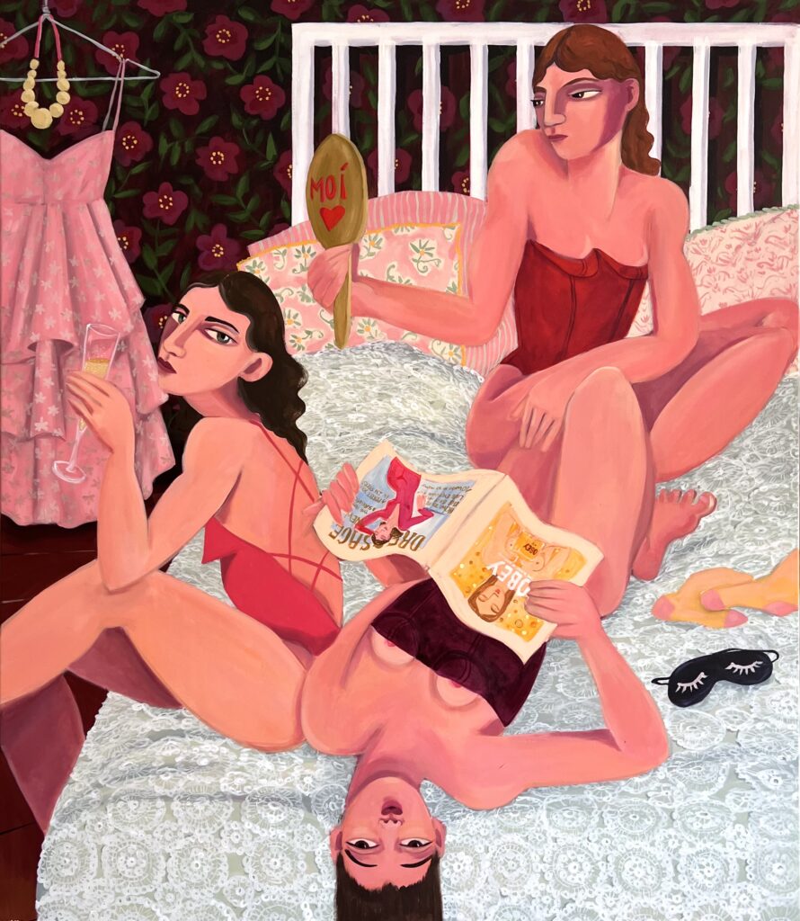 It was a very organic shift. For years, while working in fashion, I kept illustrating for magazines and painting in my own time. I was always drawn to the human figure what began as fashion silhouettes gradually grew into complete scenes, with their own characters and moods. Little by little, painting took up more space in my life. It still carries the patterns, textures, and colours from my fashion days, but now those elements serve the stories I want to tell, rather than the other way around.