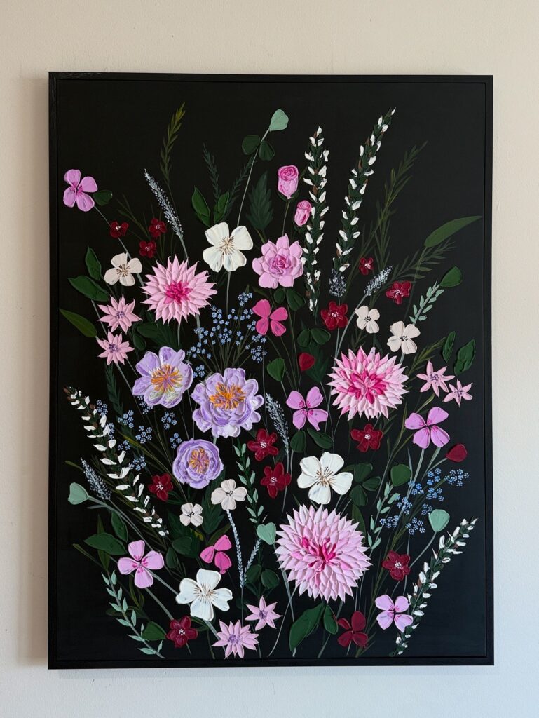 Kellie is the kind of artist whose work feels like stepping into a garden after rain, quiet, alive, and full of texture waiting to be discovered. The creative mind behind A&M Creative, she doesn’t just paint flowers, she builds them layer by layer until they seem to bloom right off the canvas. Her journey began with one piece, a single floral statement created to bring warmth and colour into her own home. That first bloom sparked something bigger, leading her from a personal project to an artistic path that now fills homes across Australia. As a full-time mum to Annabelle and Millie the “A&M” that gives her studio its name Kellie balances motherhood and creativity, often working in the in-between moments of her day.