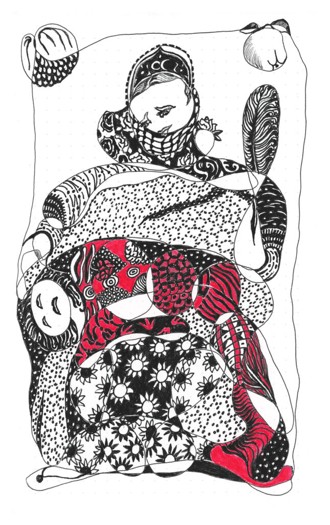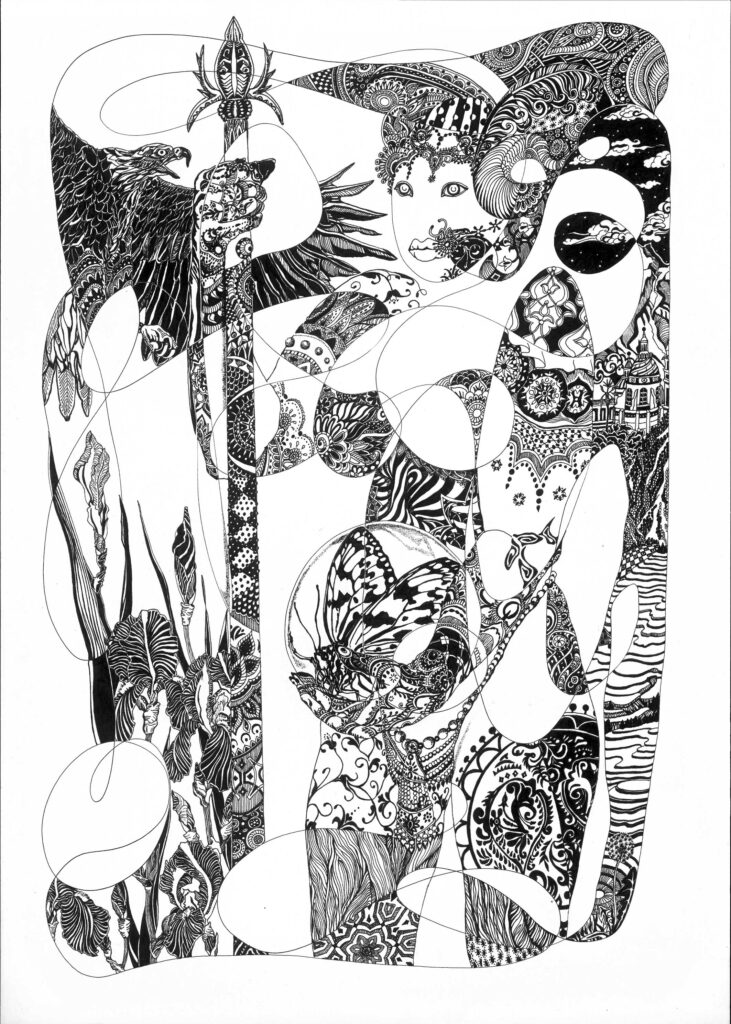 5. How do the themes of gender research and creation myths influence the figures that appear in your collages and drawings.