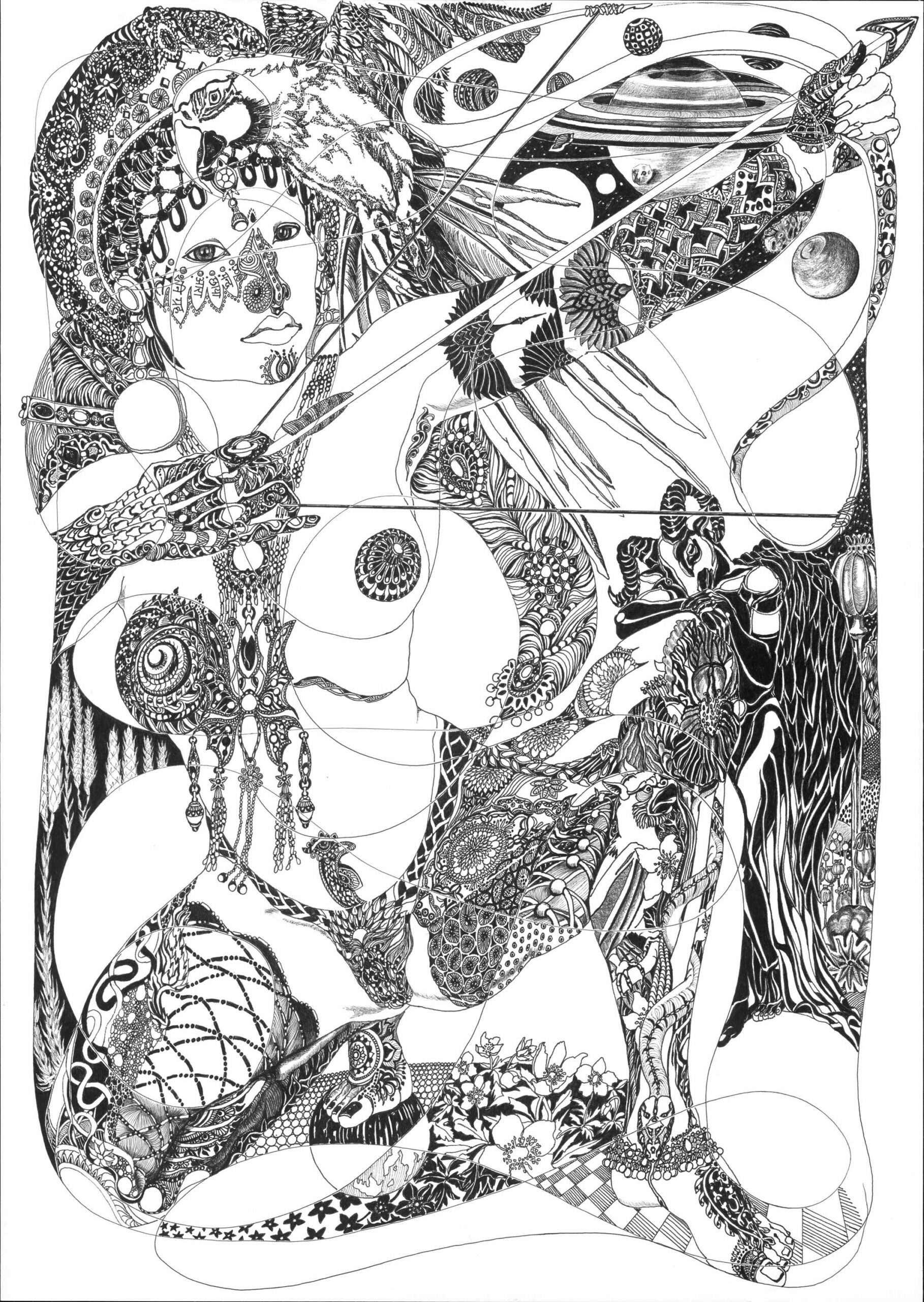I had very young parents and was often present at rehearsals and premieres. So to speak, I grew up on and behind the stage, where I reencountered my fairy tales and myths in old and new costumes. The memories of all these sensory impressions, meanings, and above all, the inner syntheses are a constant stream in which I swim when working with a piece. It is no wonder that I am a storyteller in my images. Of course, I did not grow up in a fairy tale. Reality and people have many faces, and I was already able to observe them as a small child. This sensitivity, along with my inherent curiosity and search for truth, led me at the age of 36 to study Critical Psychology. A then-unique institute at the Free University of Berlin, sadly long dissolved and banned, probably because it offered a truly enlightening, emancipatory course of study. With a critical eye, research methods, from the interpretation of results to history, philosophy, religion, and politics within psychology, were examined, as were the research goals and science funders. My studies are multipliers for layered perceptions that seek connections to the existing and the future. Like the parts of a collage. Like the meeting of accidental and deliberate lines in a drawing, creating something new: a chimaera.
