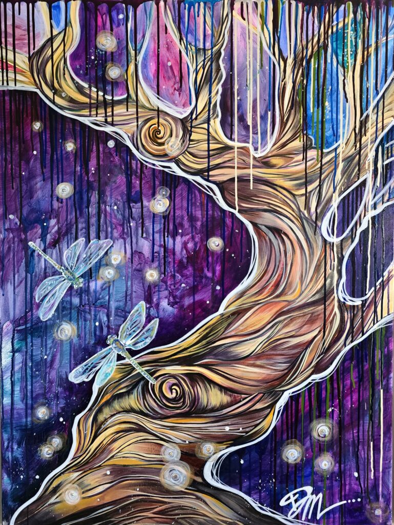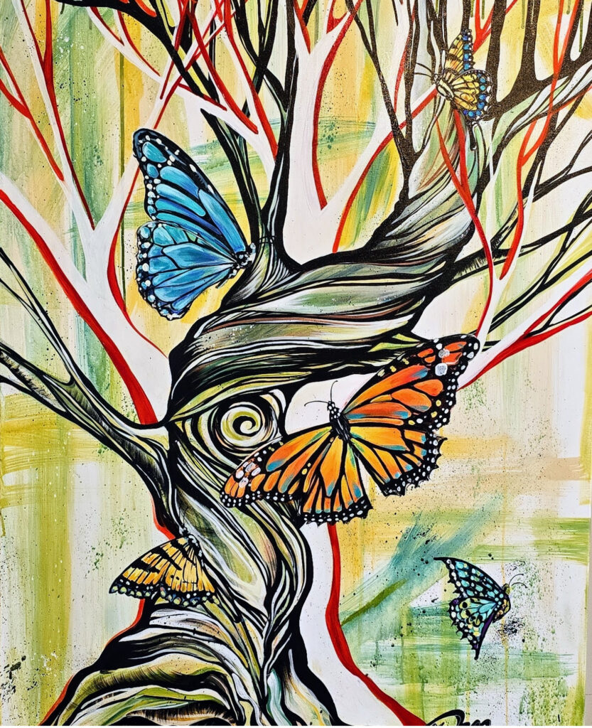 And there is something about how she talks about her process that we think every artist needs to hear. She describes a painting like a breath. Moments of movement and moments of rest. When a piece feels uncomfortable or unresolved she does not rush to fix it. She sits with the tension because she has learned that tension usually means something important is happening. She listens to the painting. She listens to herself. And she knows the difference between discomfort that is holding energy and discomfort that is blocking it.