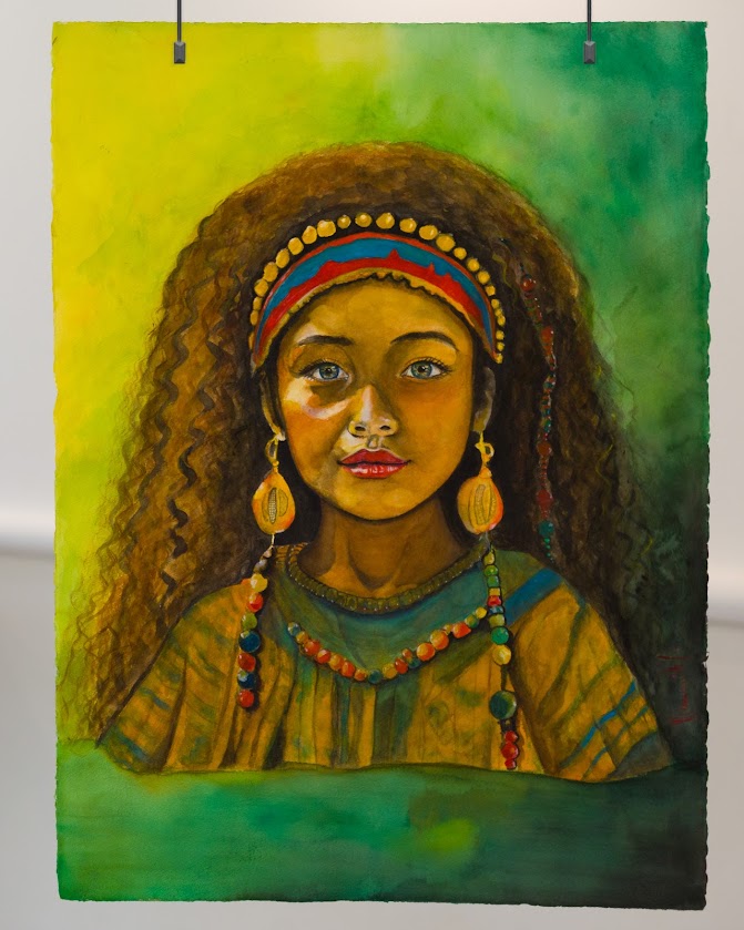 She also explains how her background in psychology continues to inform her portraits of women. Rather than focusing on surface likeness, she works toward moments when clarity and direction quietly appear. Real women inspire some figures, while others arrive without a clear source, asking only to be given space on paper. Watercolour, with its unpredictability, supports this way of working by allowing chance and intuition to guide the final image.