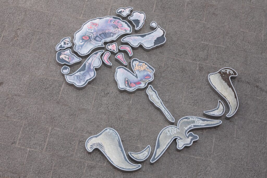 I always start from the assumption that the viewer is an integral part of the work—especially when working with monumental, site-specific pieces. My iconographic interweavings can appear bizarre and sometimes even merely decorative, and it is precisely the use of forms and words “familiar” to the human mind that allows the viewer a more ecological approach, even to burning social issues. And we return to the paradoxes I mentioned above. It’s clear that my poetics have strong libertarian roots. And it’s also true that, in this sense, it would be unnatural to expect my message to be unambiguous.