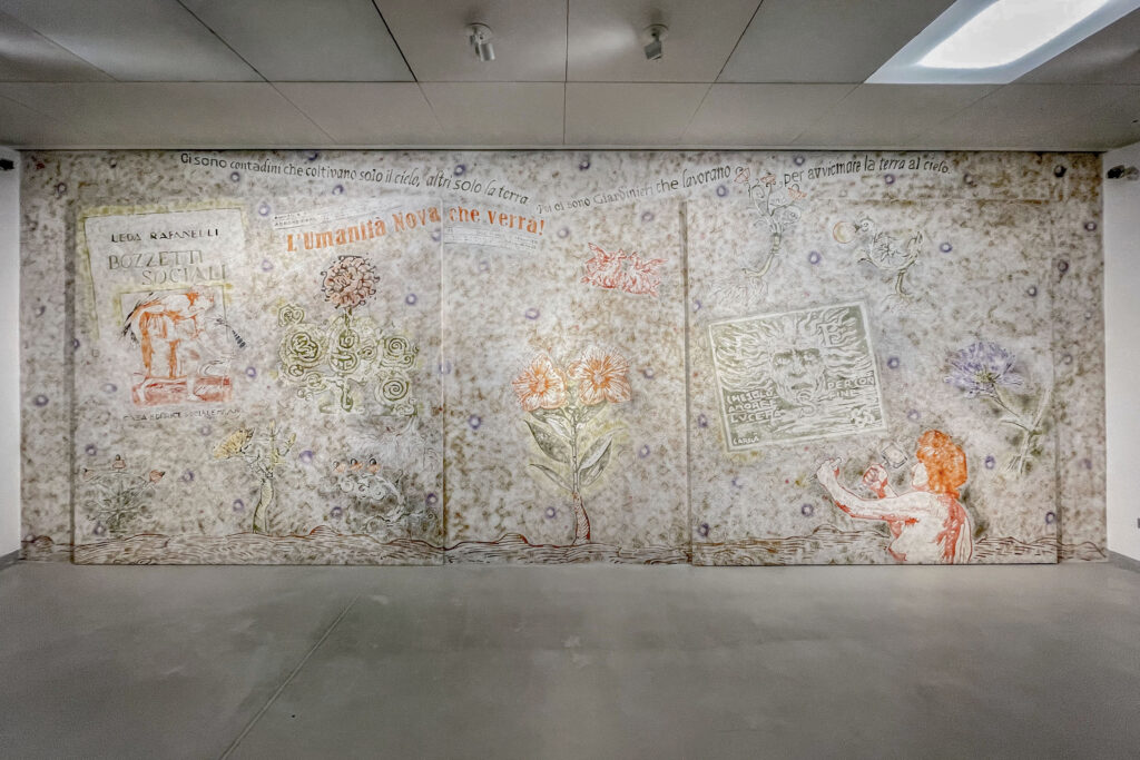Before a formal translation, I usually “write” the project after months of research in archives that preserve collective memory. I often collaborate with historians, sociologists, anthropologists, and, of course, botanists to uncover possible connections that create new visions of the world. Indeed, my goal is connecting the physical, mental, and emotional landscapes that may seem dissonant at first glance. When I find these connections, the paradoxes occur! II call these the “everyday miracles” that later I formally translate in artworks. I have a passionate passion for the stories of human beings and plant species—especially the lesser-known ones—which I enjoy comparing by studying the dynamics of migration, adaptation, and coexistence between them. After all, great changes have depended on the movement of these elements. Therefore, the history of gardens is a narrative of human events. This is what happened with “Getesemani”, even though I cited a well-known context within which I sought the unexpected. I imagined a multidimensional dialogue between two women— Myriam di Magadala, definitely famous but very misunderstood – and the Italian writer and activist, Leda Rafanelli, who frequented the Futurist circle, in particular Carlo Carrà, also cited in my pictorial installation. Getsemani is now acquired in the collection of the Museo del Novecento in Milan which boasts a large section dedicated to the Futurists, precisely.