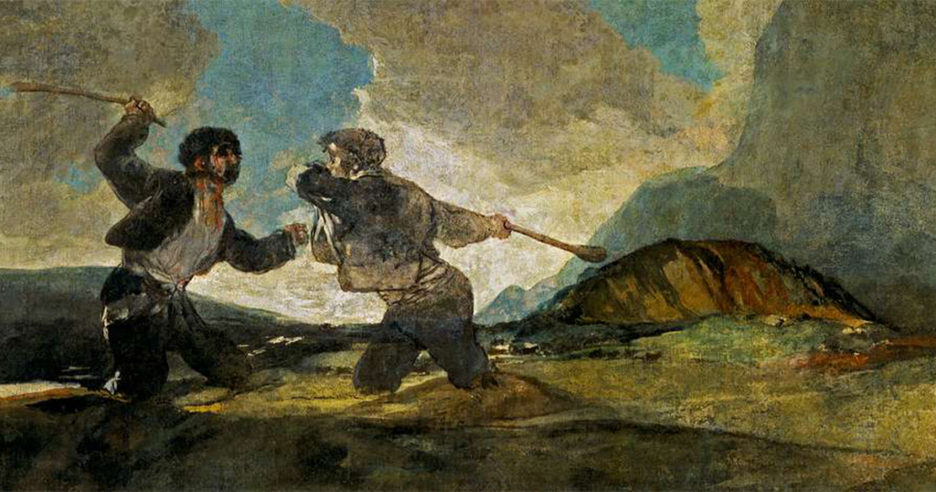 In Fight with Cudgels, Francisco Goya presents a scene of direct conflict, two men locked in combat, raising heavy sticks against one another. At first, it appears straightforward: a violent encounter, frozen at its peak. But the longer one looks, the more the painting resists that simplicity.