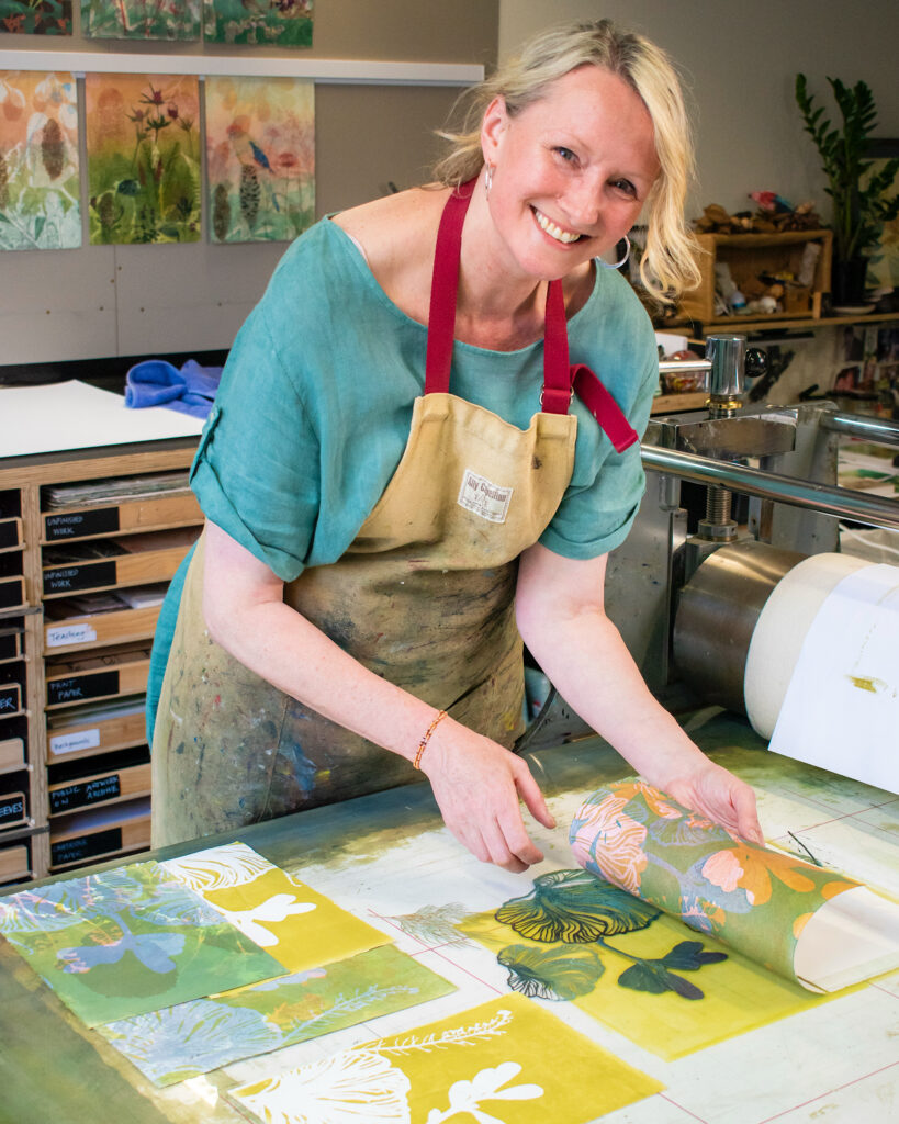 When I step into my studio, whether it’s my city space or on the farm, the first feeling is always a sense of belonging. It feels like I’m arriving home, somewhere that already knows me. I’m immediately drawn to my works in progress: the stacks of unfinished pieces and the heavy boards where completed works are drying. They tell me where I’ve been, and gently remind me where I’m going next. Because I move between two studios, there’s a moment of re-acquainting myself to where each work is up to. I sort through the unfinished pile, letting a particular piece quietly call me back in. Sometimes it’s a half-formed image that sparks a curiosity, other times it’s the inking slab, where I’m guided by the colour that feels most alive to me in that moment. This gentle process of noticing, remembering and responding is how I settle into work, slowly, intuitively, and in conversation with what’s already waiting for me.