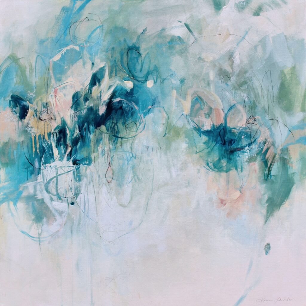 Often, as I approach a blank canvas, I instinctively dip into my roots and begin a painting by simply stepping into the flow of movement that I am accustomed to and have developed through my drawing and writing habits. Throughout my painting process, bits of personal history will show up as literal or asemic writing, calligraphic marks, lyrical flow, and line work. I often incorporate charcoal and graphite pencil into my abstract acrylic paintings because it’s natural to vacillate between those familiar mediums and ways of creating. It feels like me. I don’t believe there is a right or wrong way to make it. It’s about leaning into what you love.