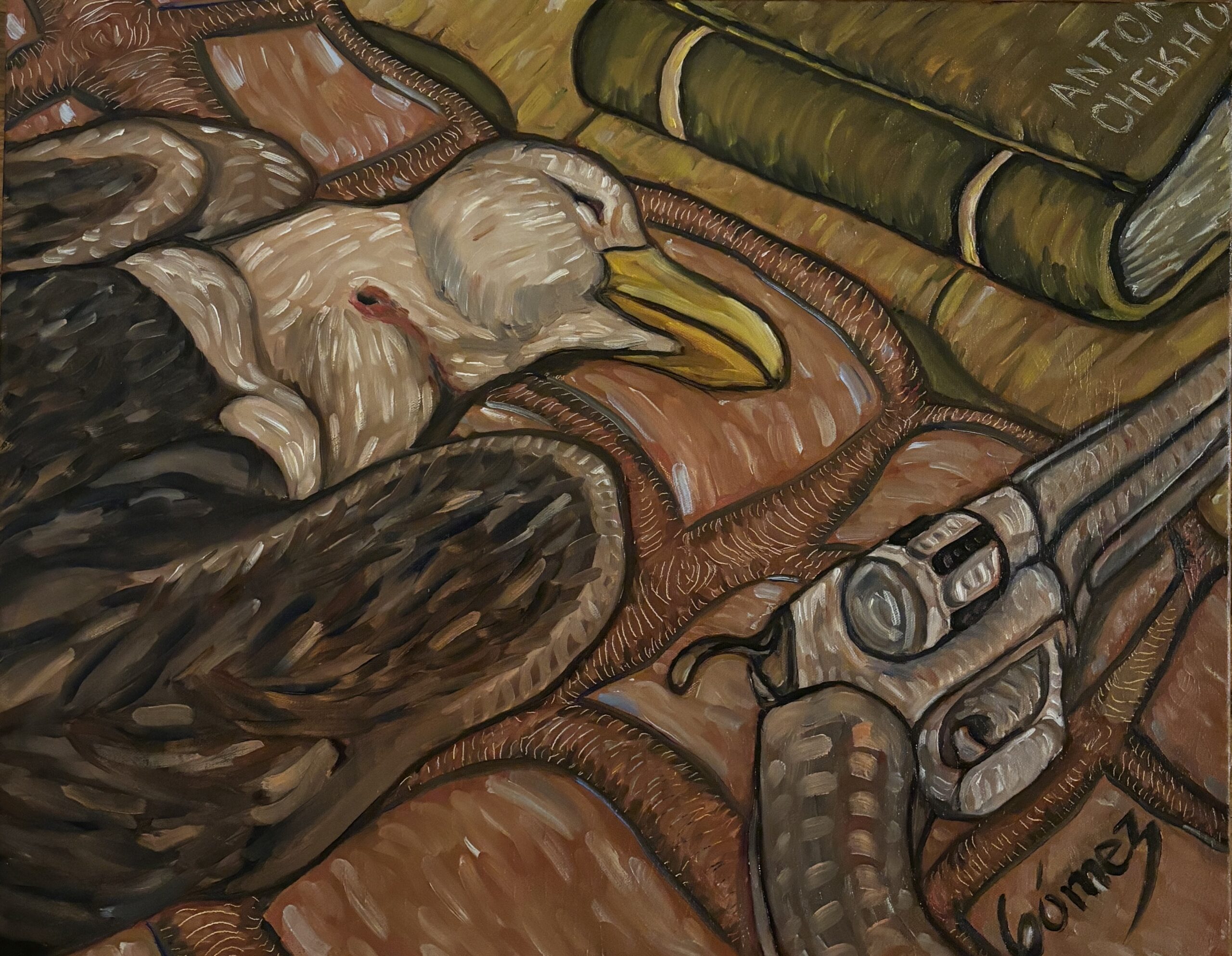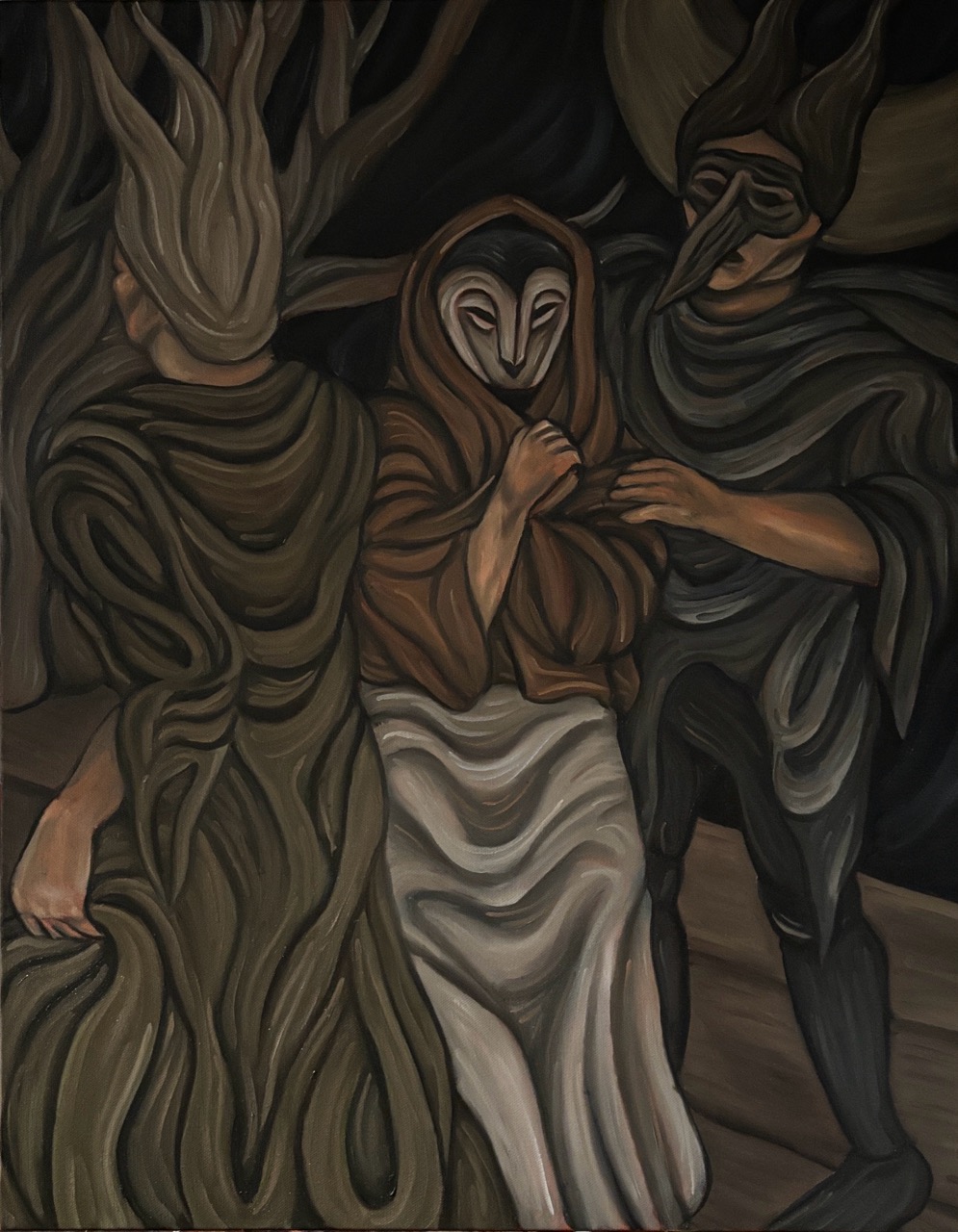 When I think of a painting, I like to think of it as putting on my director’s hat. I envision a story in my head as a scene and ask myself how I’d like to see this story play out onstage. This is what draws me to a more figurative style, allowing me to stage people and/or objects as if I were capturing a moment in a play.