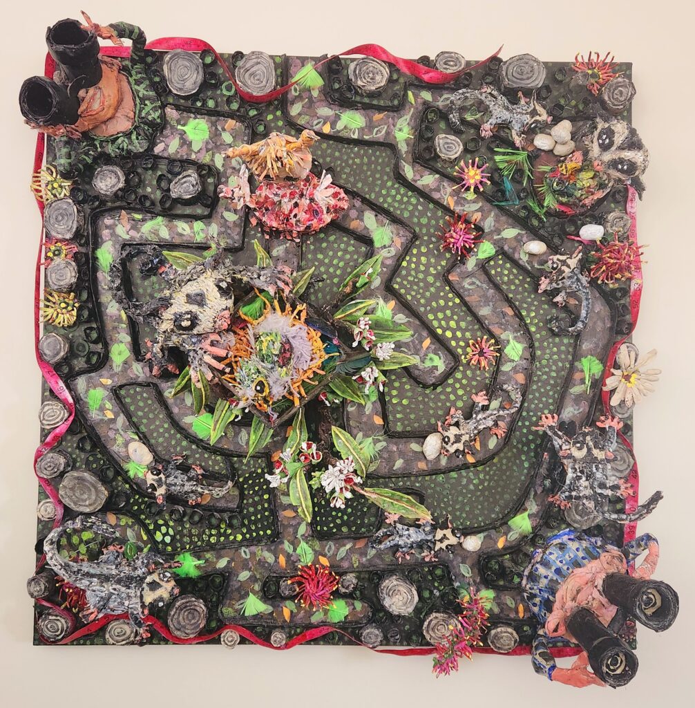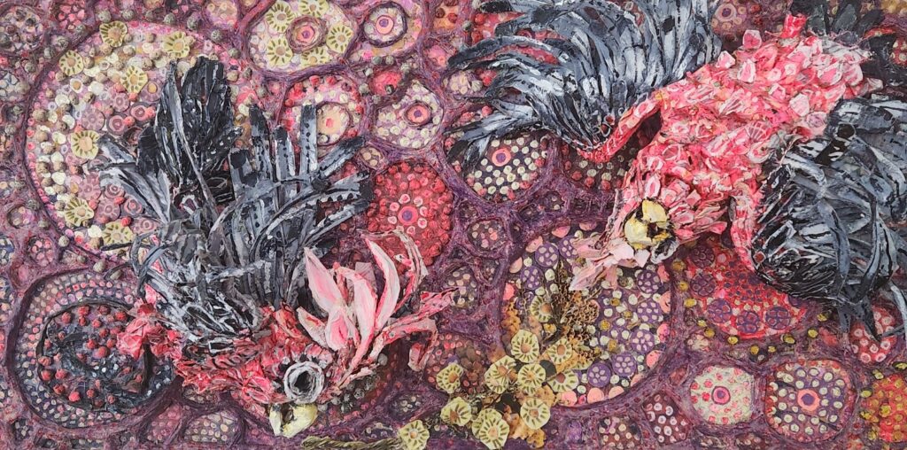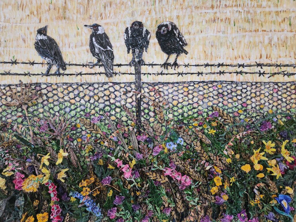 Today everything she makes is built in layers that push off the surface. Nothing sits flat. She calls it sculptural painting. She paints birds constantly, pelicans, cockatoos, the critically endangered Swift Parrot, and none of them are just birds.