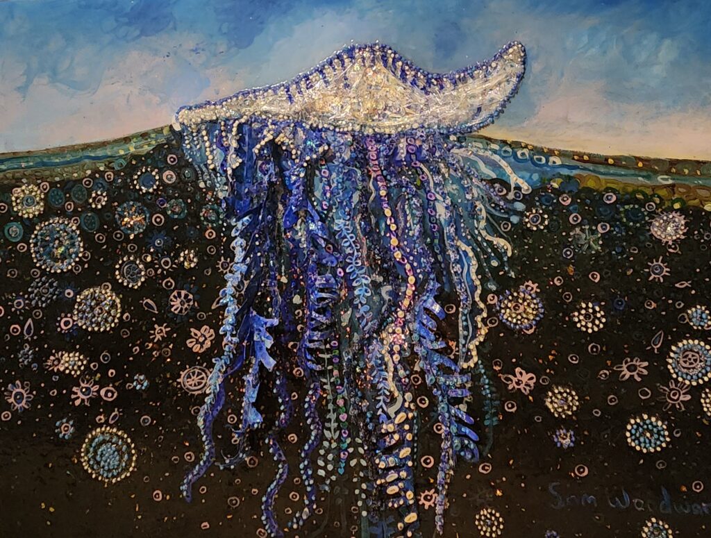 I have one painting in particular that a lot of people seem to feel a religious and spiritual connection to which involves a beam of light and a bloom of jelly fish. Light has been historically used by artists to build community and explain an internal knowing and give hope. In uncertain times most people are voicing a feeling of uncertainty and lack of positivity about the future and are wanting hope. No one person should have so much power that they can negatively effect the future of a planet . I painted my painting “Is extinction too swift for our parrot ” because I wanted people to make a connection and have an understanding of the critically endangered Swift Parrot plight to help save the bird from extinction. Artists can be powerful tools and the individual can become mighty and effective with support.