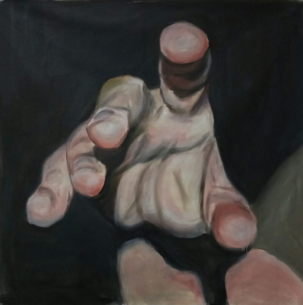 “Dimitto” (2022) is part of an ongoing investigation into gesture, inspired by chirology — the study of gestures used to emphasize rhetorical appeals. As in theatre, where gestures must be potent and expressive, in this work I tried to expand that idea within painting, allowing meaning to emerge through the scale and amplitude of the gesture itself. On a more personal level, I see this piece as a nod to the narrative possibility of theatre transposed into a pictorial gesture. It’s as if the gesture, once performed in a scenic space, now finds another kind of presence on the canvas — silent, yet still charged with action and intention.