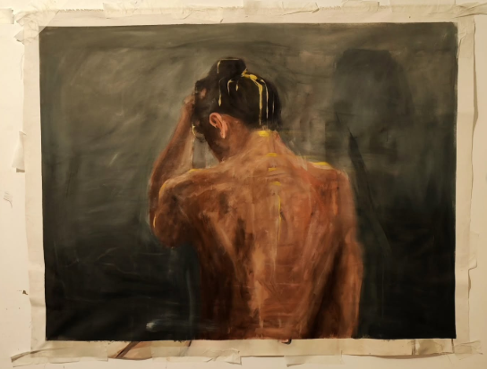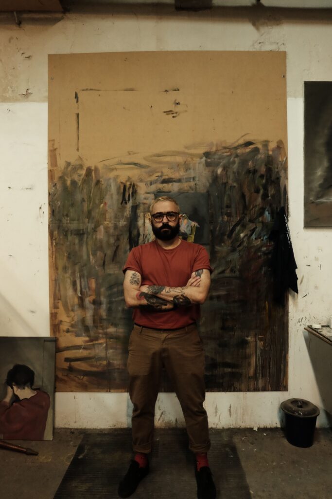 His process is its own kind of performance. He often photographs his own body, or, at times, his wife’s, not to document identity, but to access a physical state that later dissolves in the painting. The body becomes a passage rather than a subject, a familiar starting point that transforms into something unrecognisable once it enters the canvas. His paintings unfold in long, intense sessions, yet the days leading up to them, the waiting, the watching, the quiet attention are equally part of the work.