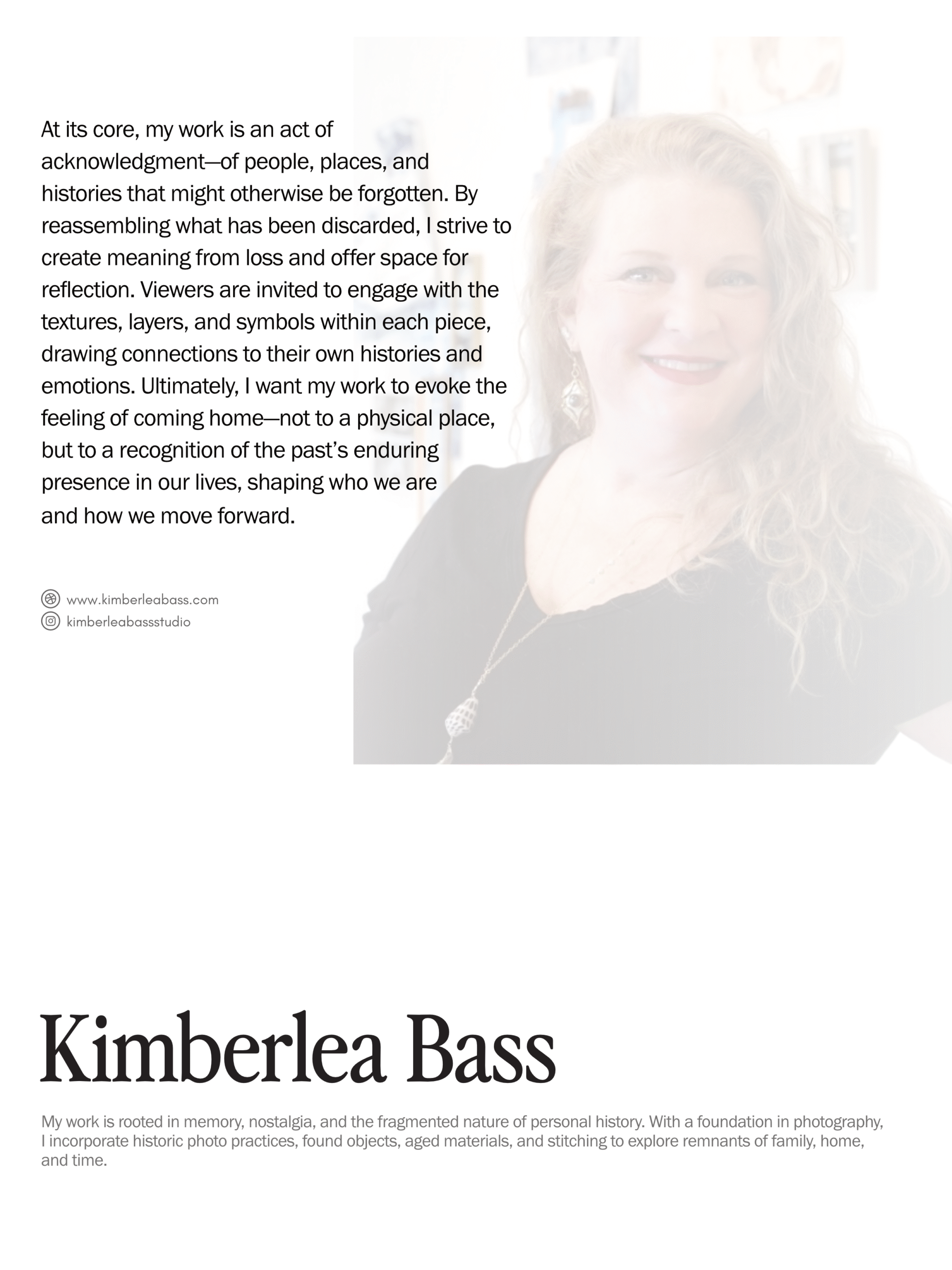 Kimberlea Bass is a multidisciplinary artist based in Fort Worth, Texas, exploring time, memory, home, and family history through 2D and 3D mixed media. She earned her MFA from the Savannah College of Art and Design in 2022 and her BFA in Studio Art from Southern Methodist University in 1995. Her work has been featured in juried exhibitions across the U.S., including New Orleans Photo Alliance (LA) Fotofoto Gallery (NY), Cedar House Gallery (GA), Fort Works Arts (TX), Fort Worth Community Art Center (TX), and Laguna Art Gallery (CA). Her work is held in public and private collections nationwide, including Drake Field Airport in Fayetteville, Arkansas. Create! Magazine, Art of the Hearts Project, The Visionary Arts Collective, and Shout Out DFW have all featured Bass in print.