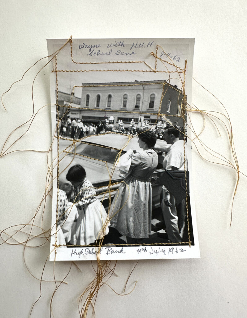 In my work stitching and layering serve several purposes. Stitching is literally necessary to hold items together. It is a way of binding and preserving. Stitching is also a metaphor for the tradition of labeling things women’s work. I have been exploring the line between craft and fine art and can the exist in the same space. I also like to challenge what materials can be stitched into. When stitching on images I usually obscure the figure. I want to hide the identity of the individual. It opens interpretation to they could be anyone from anyones family. I opens the visual narrative for the viewer to connect to the piece.