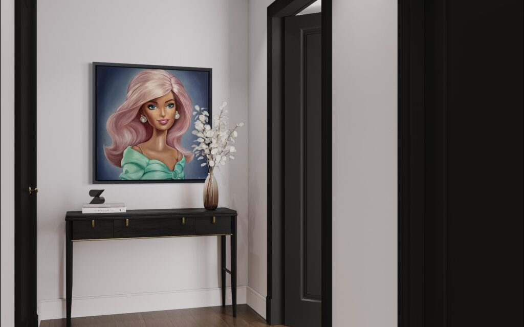 In the Barbie series, accessories function as visual cues of identity rather than simple decoration. They are intentionally oversized in relation to the doll, just as Barbie accessories are larger than their real-life equivalents. When you look at a Barbie, everything, earrings, necklaces, shoes, is exaggerated, and I translate that logic directly into my paintings. I have collected more than 1,000 accessories, which allows me to construct a wide range of personalities within the series. Each combination of scale, texture, and color helps define character, attitude, and emotional presence. These elements let me explore how identity is built through details and surfaces. I am currently working on a commission in which a client asked for her portrait in the Barbie style, incorporating some of her own jewelry, extending this visual language into a personal and contemporary context.