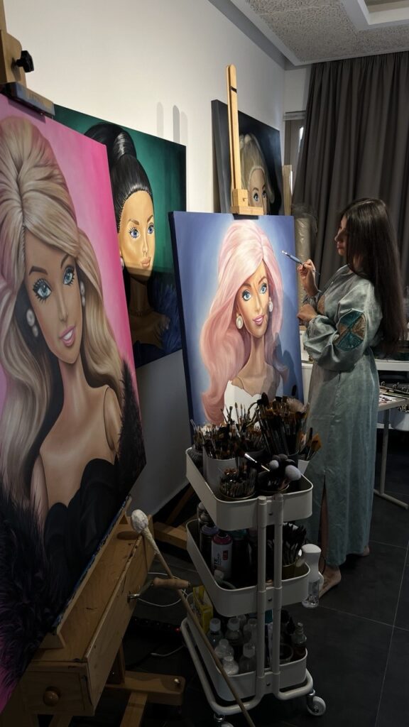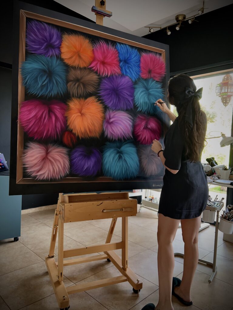 That clarity emerged through the Fluffy series, where soft, familiar forms painted with precision created a strong contrast between technical control and emotional openness. After discovering my voice with Fluffy, I wanted to push it further by exploring new textures and surfaces. This led to the Barbie collection, where I moved from fur to skin and plastic, translating the same emotional language into a different material reality. Today, I am working with yet another texture , more liquid, reflective, and transparent. This exploration resulted in the Cocktail collection, where all these textures come together, allowing me to play with light, reflection, and sensuality while continuing to evolve my visual language.