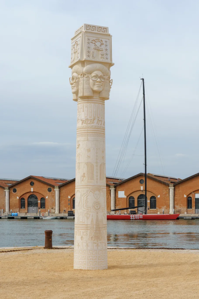 Several of the newly commissioned works reflect deeply personal and cultural narratives. Halsey’s monumental column pays tribute to her South Central Los Angeles community, while Halfmoon’s sculptural forms draw on Caddo traditions and contemporary Native identity. Elsewhere, Reyes’s volcanic stone sculpture references pre-Columbian cosmology, and Katō’s hybrid figures invoke animistic beliefs tied to the natural world.