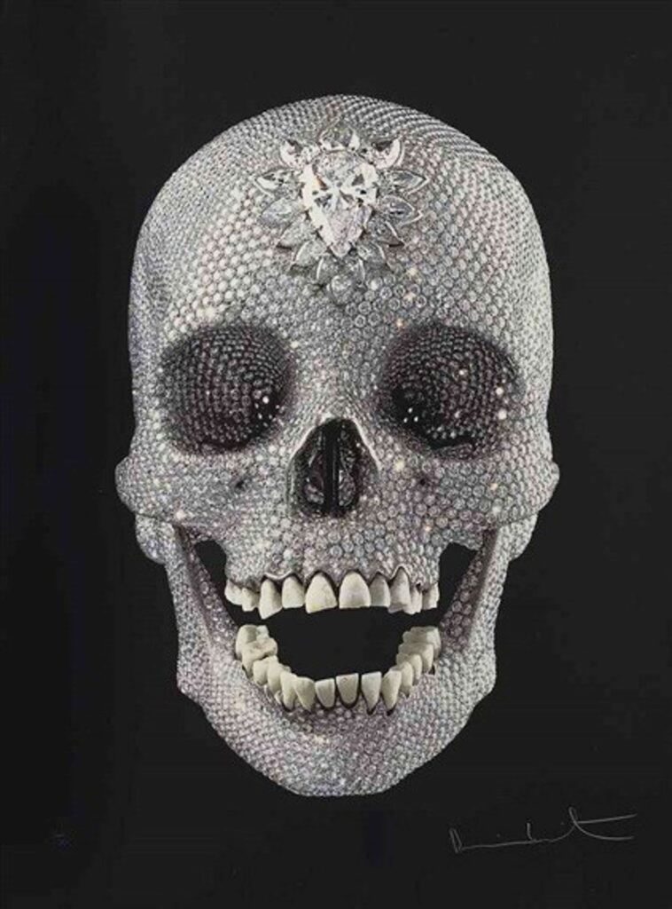 Created in 2007, the work transforms an 18th-century human skull into an object of extreme opulence. Cast in platinum and encrusted with 8,601 diamonds, including a striking 52.4-carat pink diamond set in the forehead, the piece reads as a contemporary memento mori, reimagined for an age of excess and spectacle.