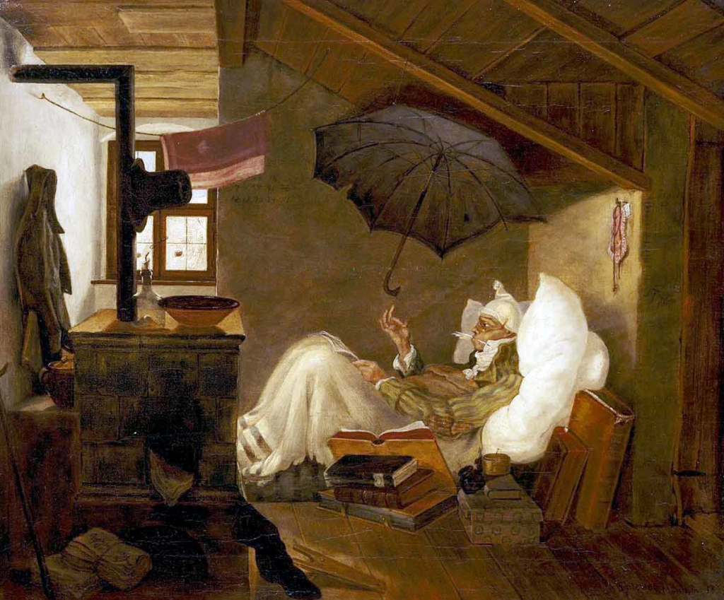 At once humorous and quietly melancholic, The Poor Poet by Carl Spitzweg has long been read as an image of artistic devotion under precarious conditions. Painted around 1839, the work depicts a solitary writer lying in a cramped attic, shielded from a leaking roof by a suspended umbrella, an absurd yet tender symbol of creative survival.