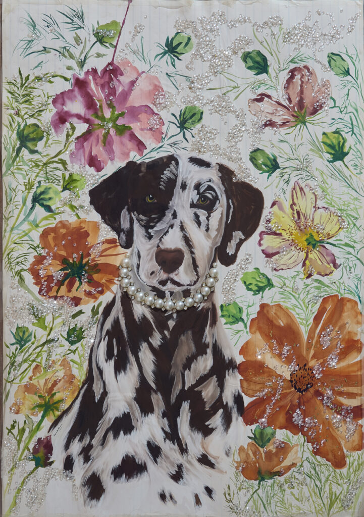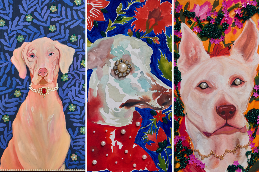 Not Just Dogs is Charuka Arora’s latest body of work, presented by Arts to Hearts Project and on view exclusively on Artsy from April 1 through April 27, 2026. The exhibition brings together a series of dog portraits, each one named after a woman, each one built through Arora’s process of layered painting and handcrafted embellishment. Watercolour, gouache, and acrylic form the ground of each work. Pearls, beads, and rhinestones are applied over the surface, one by one, in a process that is as much an act of care as it is an act of making.