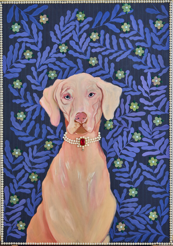 In Arora’s practice, adornment is a language with a specific grammar. She grew up in Agra, in a culture where the decorative arts are not separate from the fine arts, where craft and embellishment carry meaning, where objects worn close to the body, jewellery, fabric, the materials of adornment, are also carriers of identity, memory, and inheritance. The beads and pearls that trace the figures in Not Just Dogs are not ornamental in any dismissive sense of the word. They are the point. They say: this subject has been attended to. This subject has been dressed for the sitting she deserves. This subject, in the language of material, has been honoured.