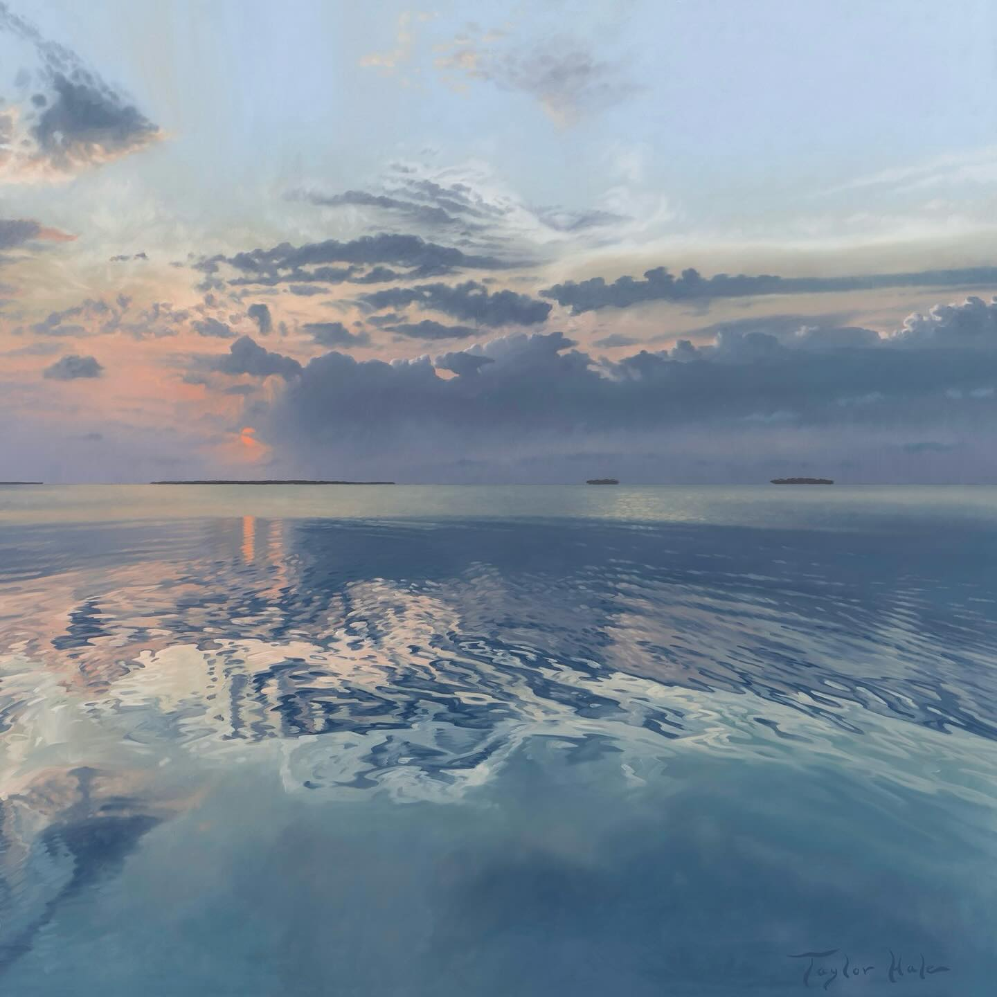 What makes his paintings so deeply human is their simplicity. He doesn’t crowd the canvas. He lets air, light, and openness do the talking. Through patient layers of oil, he creates atmospheres that feel familiar places you’ve stood before, or wish you could return to. A warm horizon. A quiet morning. A sky that makes you feel held for a moment. Taylor’s art carries a sense of presence. It isn’t about capturing a scene; it’s about capturing a feeling, the calm that settles in your chest when you look out at the water, the softness that comes with the end of a day, the stillness that lives in light. His paintings offer that same stillness back to you, gently and without insistence. In Taylor Hale’s hands, the sky becomes more than weather or landscape. It becomes a story of home, of memory, of quiet moments that stay with us long after the light has changed.