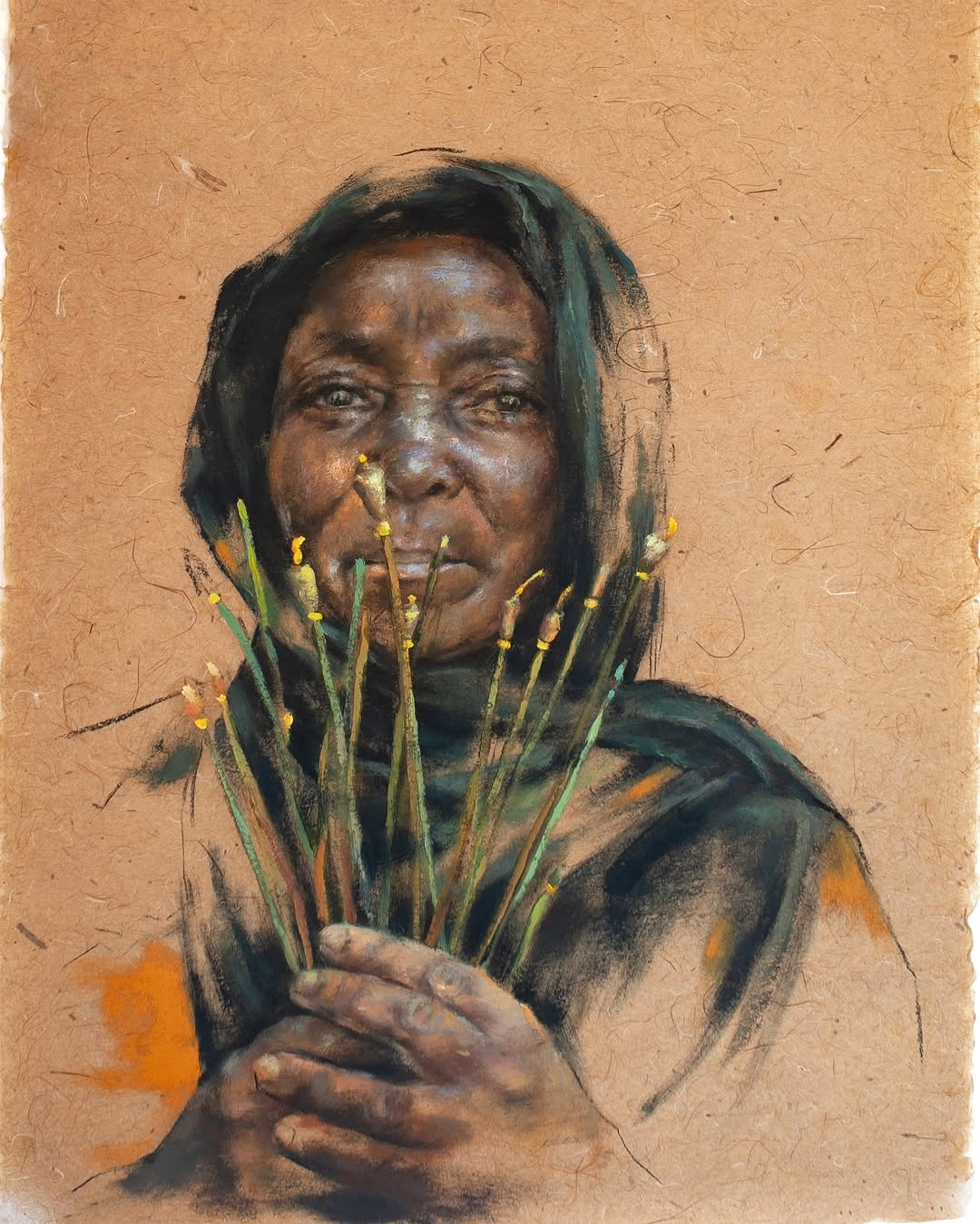 Pie Herring is a London‑based figurative painter whose work draws deeply from lived experience, cultural exchange, and community. A graduate of Edinburgh College of Art, she carries forward both technical skill and a heartfelt commitment to human stories. Her paintings often emerge from extended residencies around the world in Morocco, Kenya, Ghana, and beyond where she lives and works among local communities. These experiences fold into her art, shaping pieces that reflect not just a place, but relationships, history, and identity. While rooted in realism, her style embraces looseness and abstraction: she begins with broad gestural strokes, rivers of paint, sweeping textures, unpredictable marks before layering in detail, shaping faces and forms that feel fluid, alive, and emotionally resonant.