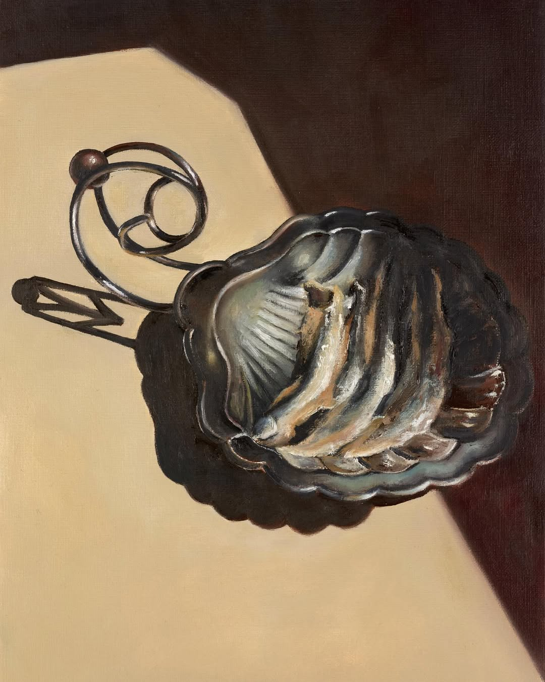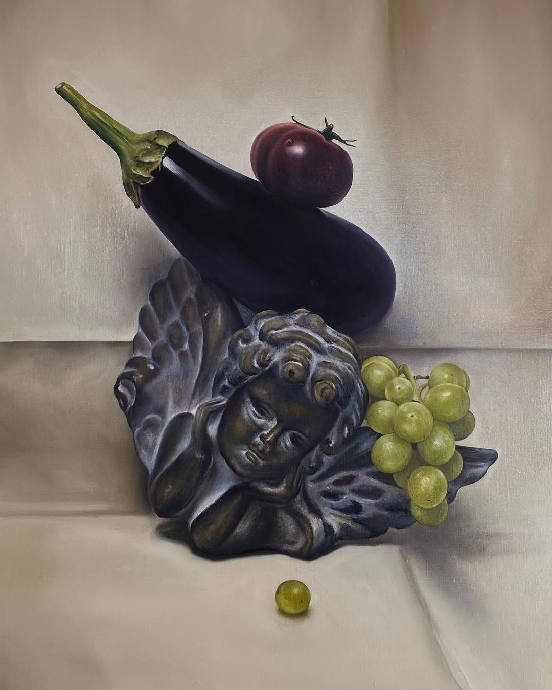 Kit Lintin is a London-based oil painter whose work feels like whispered stories told through objects. Born in Yorkshire, she studied Fine Art and eventually settled in South London, where her quiet, deeply considered practice is centered on still life but not as you might expect. Her paintings draw from classical still-life traditions the same eye for shape, light, and composition that old masters practiced but she weaves into that a gentle surrealism. Everyday objects in her work don’t just sit on a table: they float, they lean, they hint at stories beyond themselves. A folded fabric might feel like skin. A simple vessel, a cut fruit, a shadow each piece suggests something just out of frame, as though someone was there, or just left.