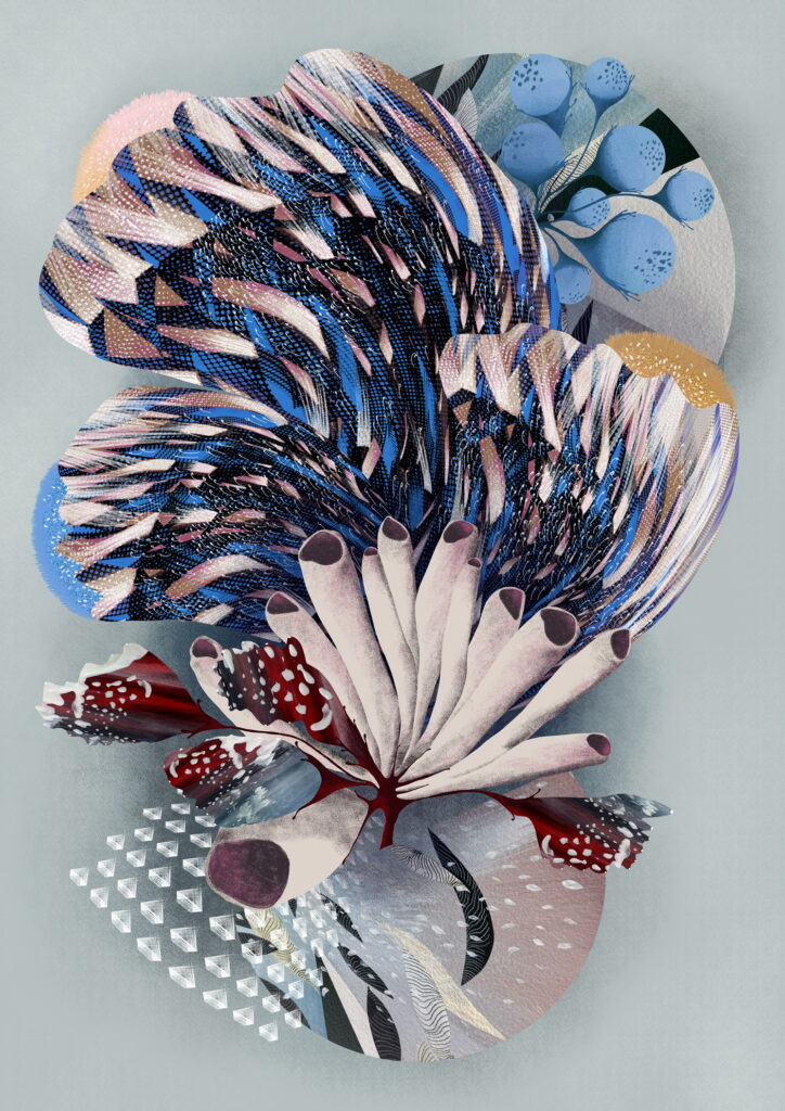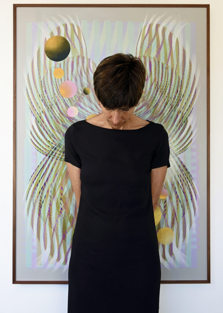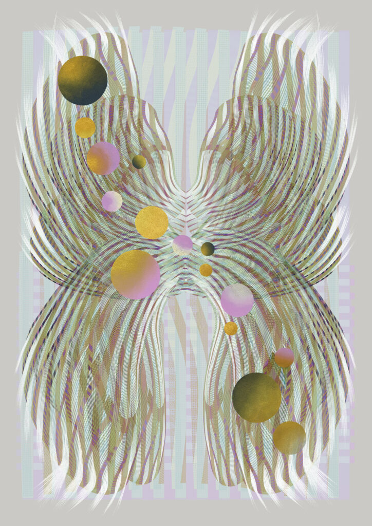 Olga Burkard’s work combines feather-like textures with geometric dots and circles