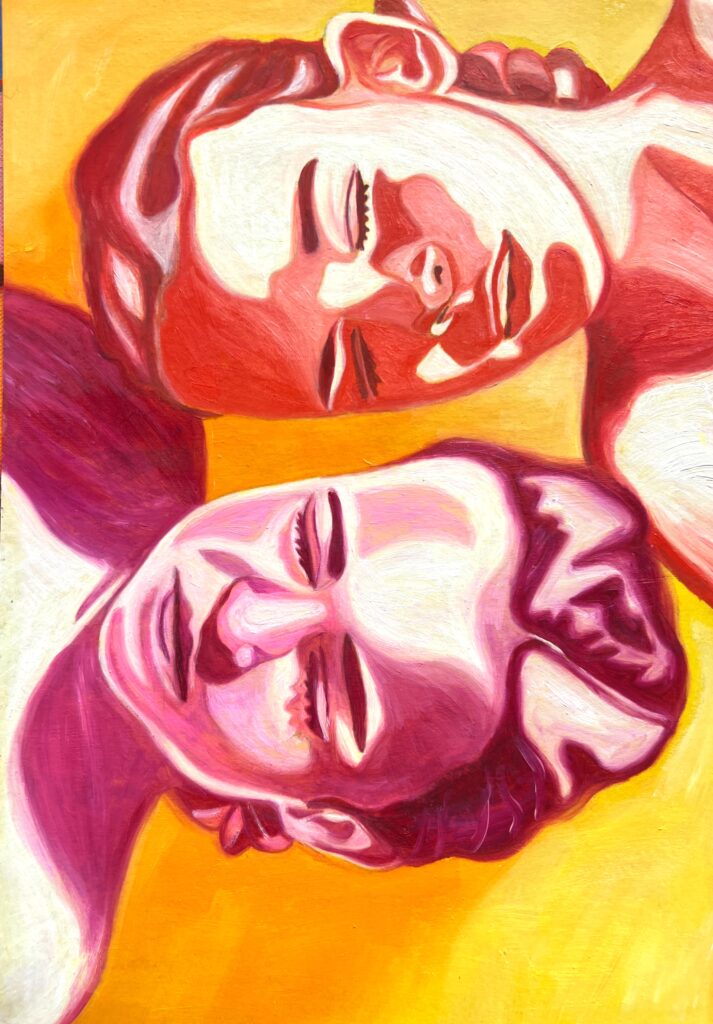 Mathilde’s paintings breathe emotion into color, transforming portraits into luminous fields of tenderness, intensity, and rhythm. After stepping away from a career in fashion and communication, she returned to painting with renewed urgency in 2020, and since then has built a body of work that speaks of presence, intimacy, and human connection.
