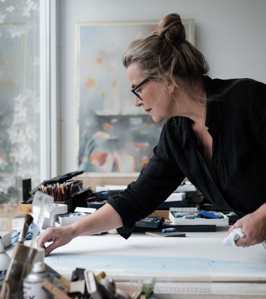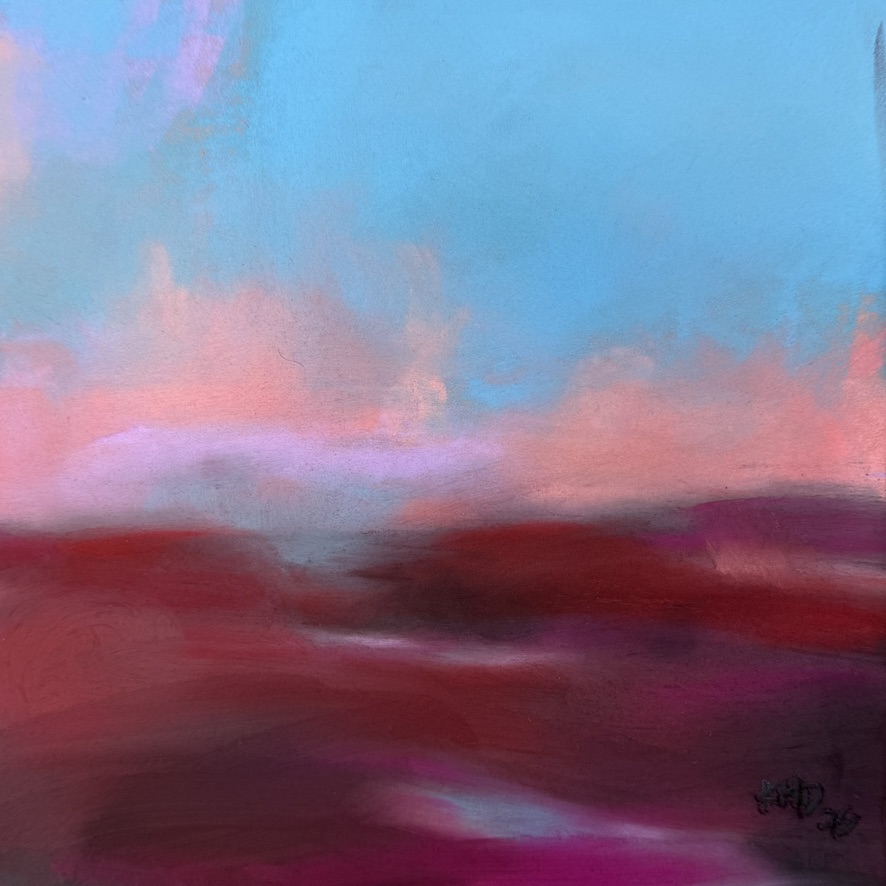 And sometimes she starts a painting with nothing. Just colours that feel right together. No image. No plan. And then landscape just starts surfacing. Water shows up. A horizon. Some sense of somewhere. She does not force it. It just comes. Because that is where her mind goes when it is making sense of feeling. Straight to landscape. Straight to water.