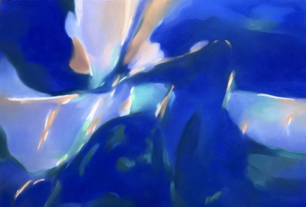 The balance between abstraction and figurative elements often evolves organically during the making process. I may begin with a purely abstract exploration of colour, light, or mood — an impression drawn from memory or a fleeting experience. As I work, an inner need sometimes arises to “make sense of it,” and subtle hints of landscape, water, or other forms emerge. These figurative touches are rarely literal; they are distilled, suggestive, and meant to evoke rather than define. This interplay between abstraction and recognisable elements allows me to maintain a sense of openness in the work. It creates space for both my own reflection and the viewer’s interpretation. The slow, deliberate handling of pastels — layering, smudging, and building colour fields — gives time for these decisions to emerge intuitively. The gestures, the shifts in tone, and the interaction of shapes and colour gradually reveal where abstraction and figuration need to meet, giving the work both emotional resonance and visual tension.