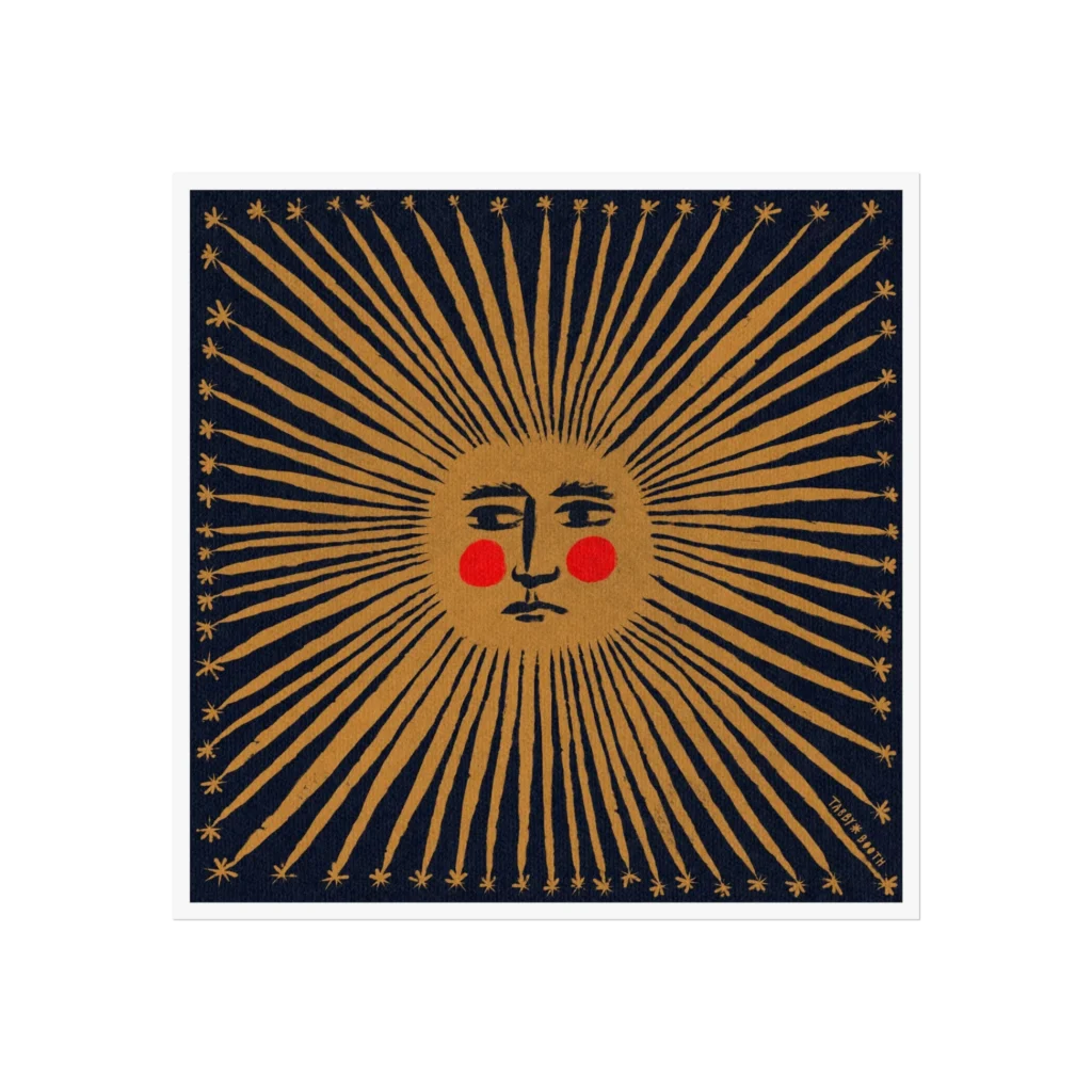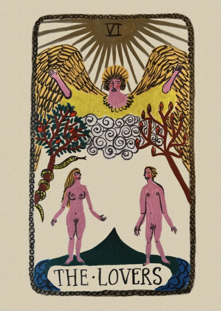 As she moved into formal study at Central Saint Martins and later into adulthood, Tabby’s sensitivity to her surroundings only deepened. From living on a London houseboat to eventually settling in Cornwall, each place affected how she felt day to day and how she worked. Tabby describes herself as a very visual person. Her mood, energy, and focus change depending on her surroundings. This shows up in her work, which often includes folk references, symbolic figures, and imagery that feels old and current at the same time.