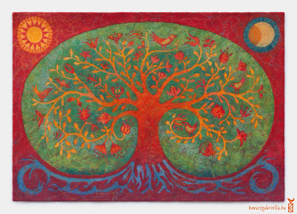 Some textile artists turn everyday materials into something magical, and Kovács Gabriella is one of them. Based in Gödöllő, Hungary, Gabriella creates felted wall hangings, cushions, teapot cozies, and other functional artworks that carry stories through texture, color, and design. Each piece reflects her deep love for nature, Hungarian heritage, and the beauty found in small details. Gabriella’s journey began with glass design and set-and-costume studies, later expanding into French tapestry weaving and carpet design. She blends these techniques to create her unique textile art, full of warmth and personality. Her work often features motifs like trees of life, pomegranates, and whimsical houses, each telling its own quiet story.