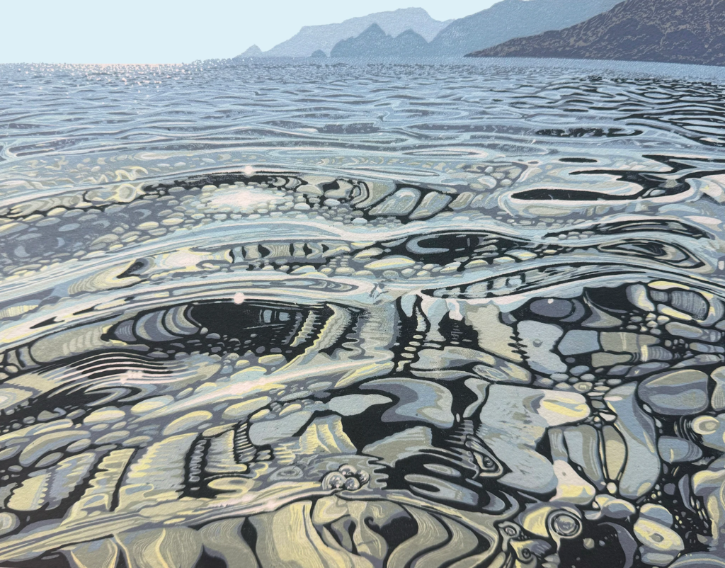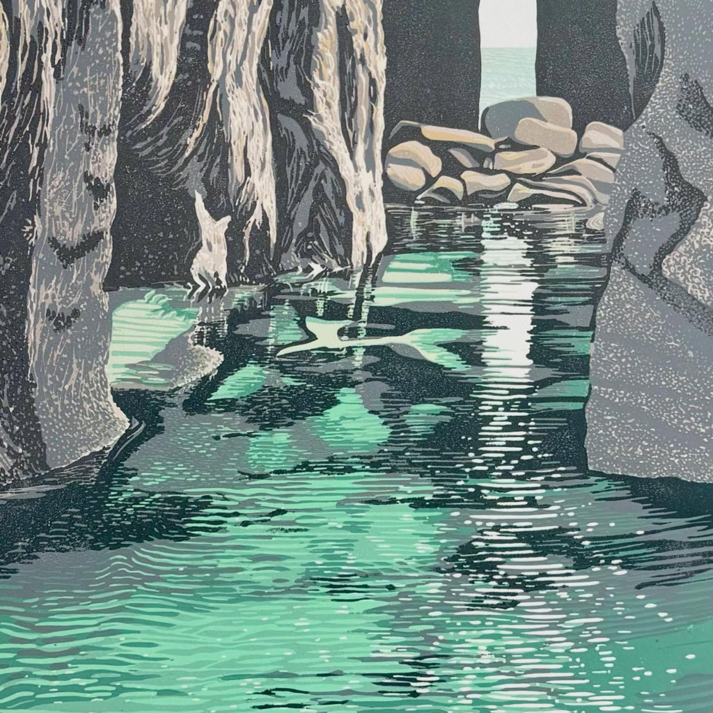 Hazel McNab’s linocut prints come from a deep connection to the natural world around her. Living and working in Cornwall, she draws inspiration from the landscapes, coastlines, and ever-changing light of her surroundings. Her work feels rooted in observation of place rather than in abstract ideas, and that connection gives her prints a grounded, heartfelt presence. Hazel works primarily in reduction linocut, a process that involves cutting and re-cutting the same block of lino to build up layers of colour. With every cut she makes, there is less surface left, so each decision matters. This method gives her prints a layered, richly coloured quality that feels both deliberate and alive. Many of her images reflect the landscape she knows so well: coastal edge rocks, rockpools glinting in shifting light, tidal pools, and sea paths are repeated as subjects because they hold a quiet beauty and subtle motion. Her attention to these small, everyday details brings out something deeper about the place itself rather than simply documenting it.